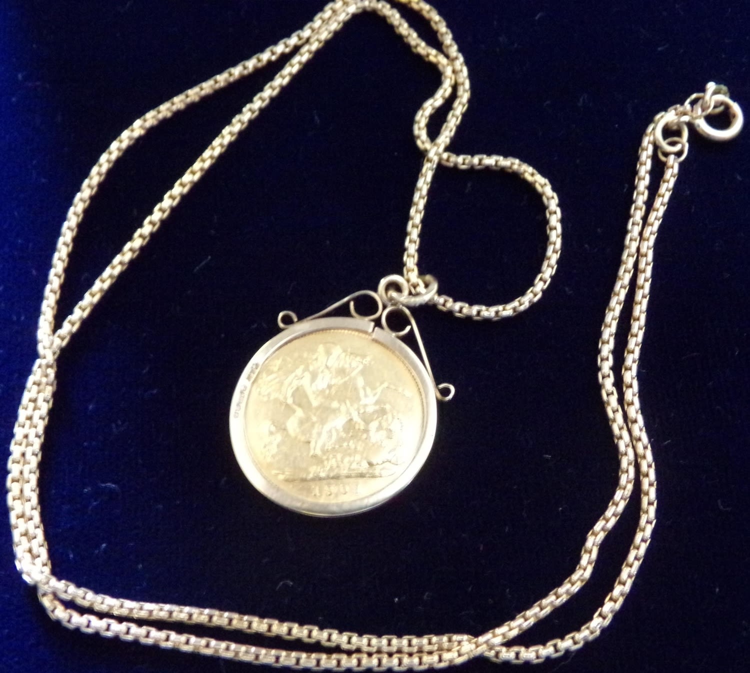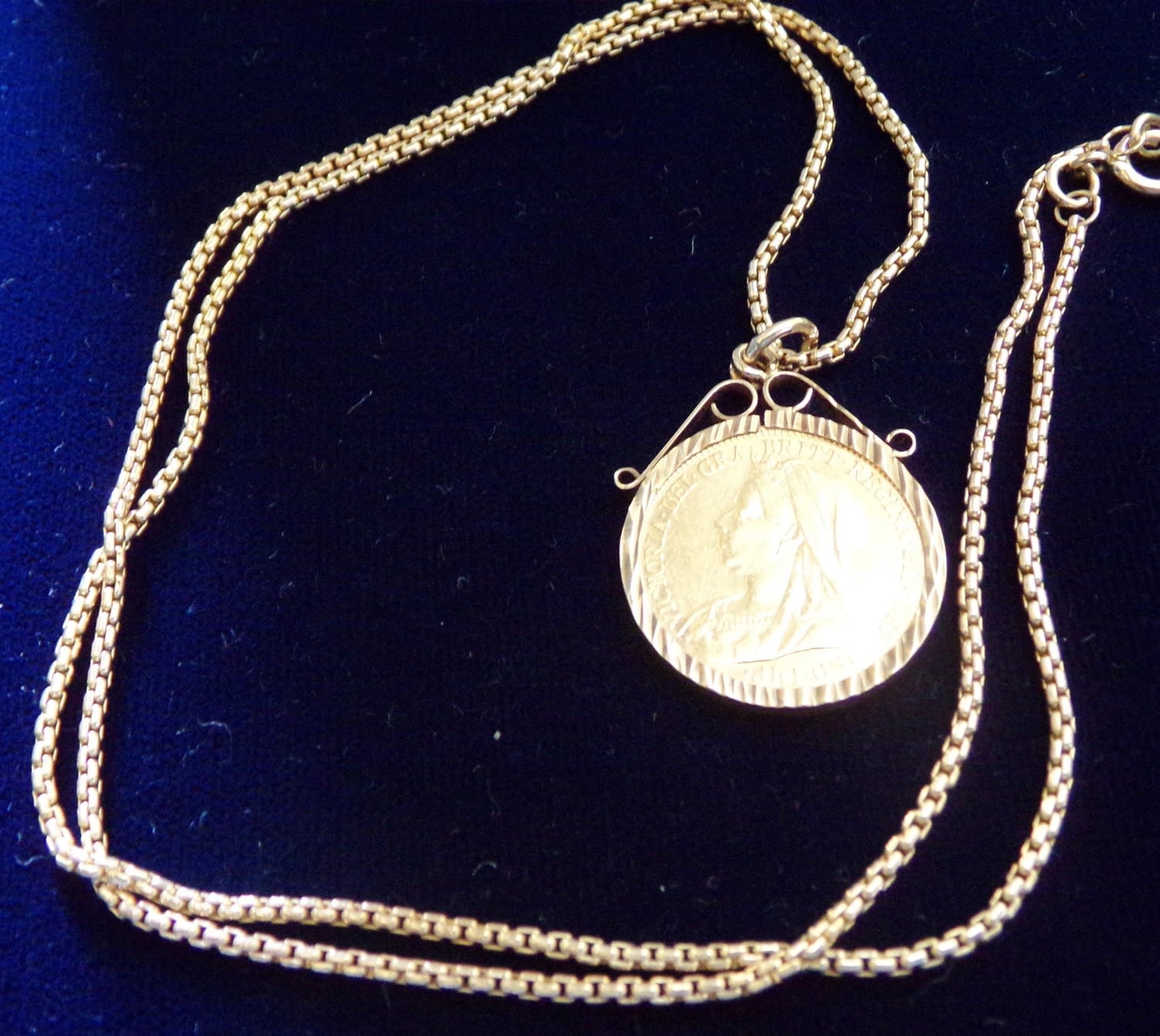 1901 old head 22ct gold half sovereign set in 9ct gold mount with a 20 9ct gold chain 11 grams approx.