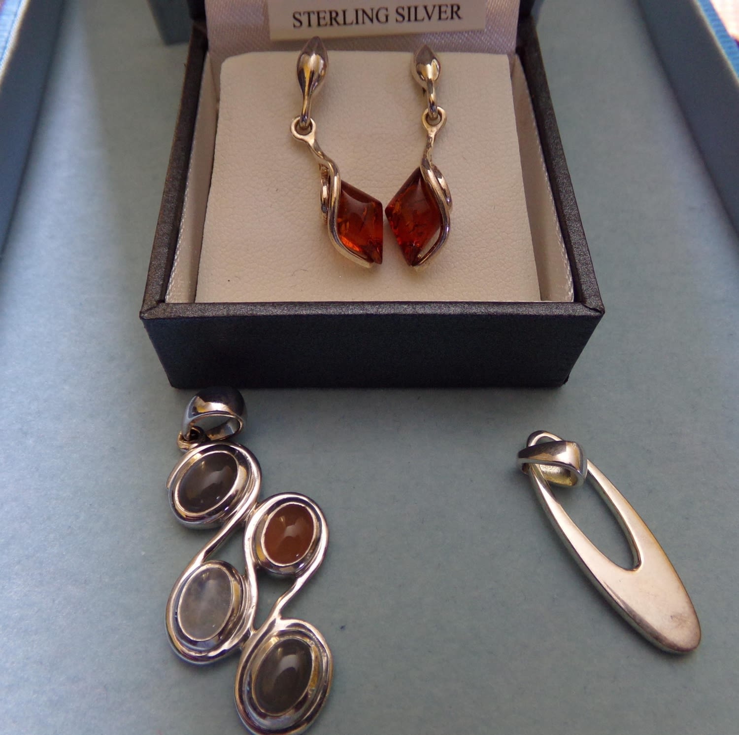 4 stone set silver pendant + solid silver pendant + pair of silver amber style set earrings