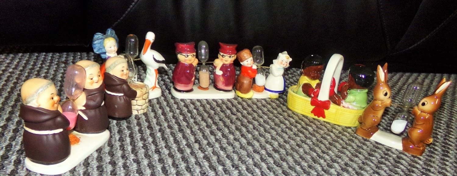 6x Rare Goebel 1940/50s egg timers + 1x 1950s Americana black boy & girl pepper and salt shakers sat in basket
