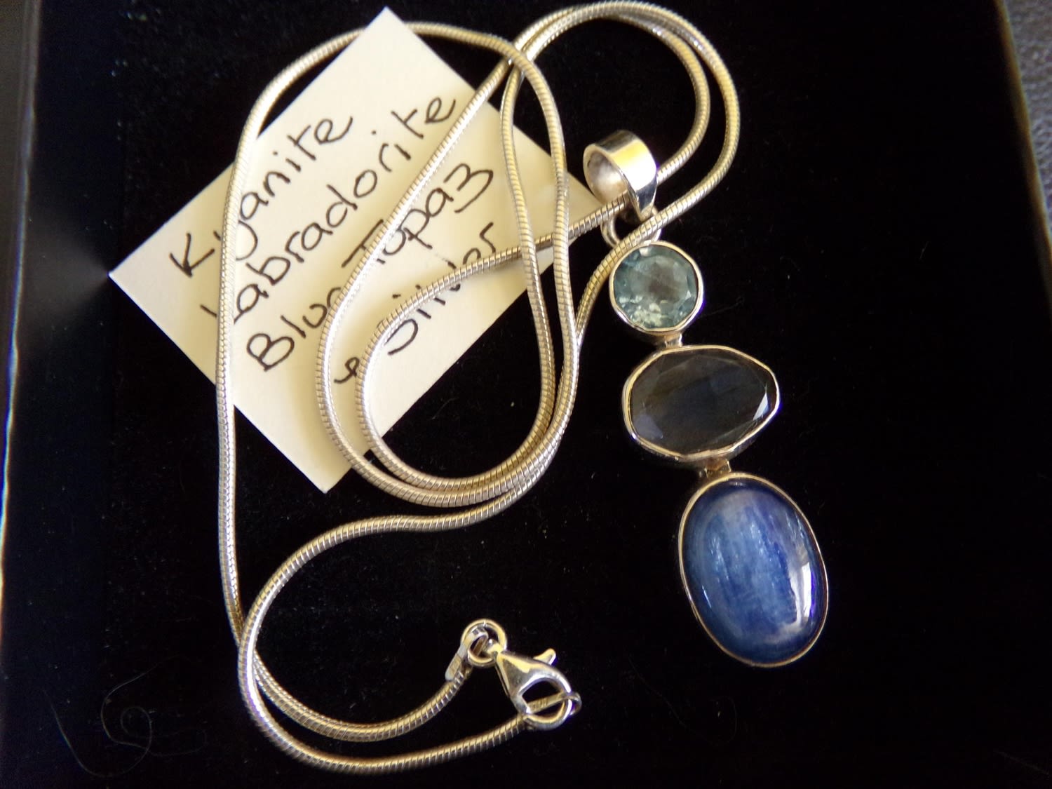 Unusual kyanite , larodite & blue topaz silver set pendant on silver chain (18 full length chain)