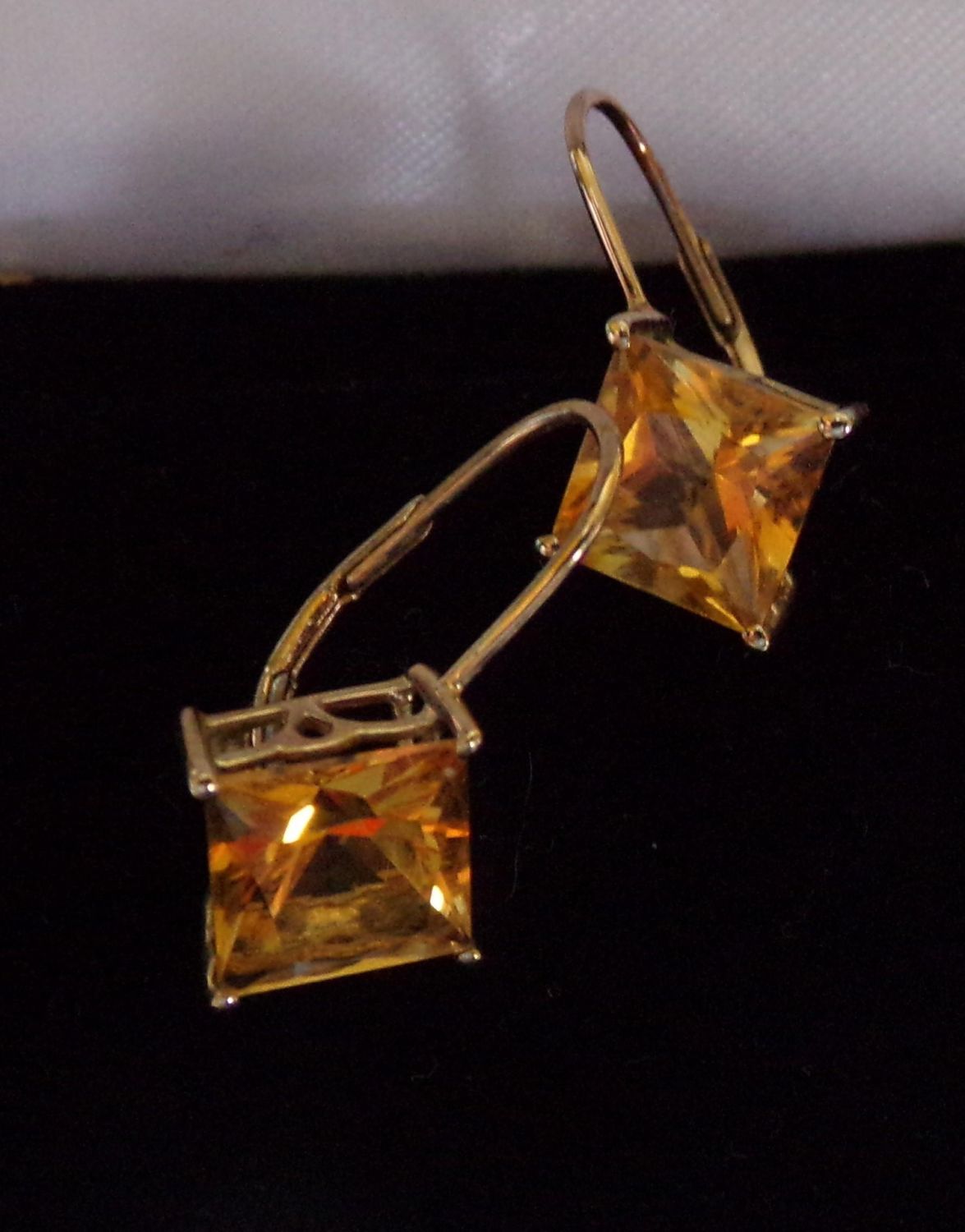 Pair of 9ct earrings set with citrine style faceted stone with claw setting to corners and raised on open pierced setting marked 9k ( tested)