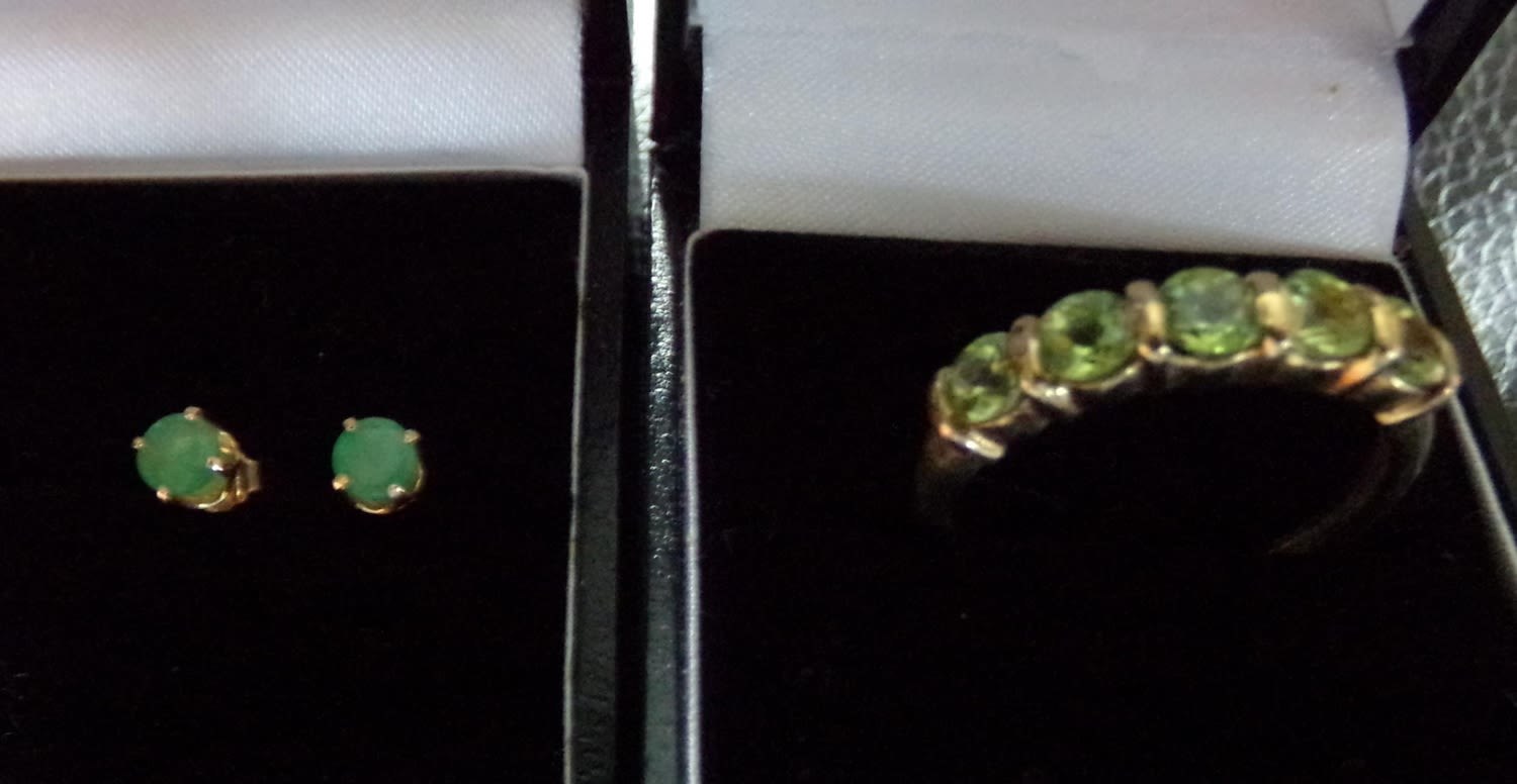 1x 14ct & 1x 18ct gold matching earrings both with 14ct butterfly backs + 9ct gold ring all set with green stones