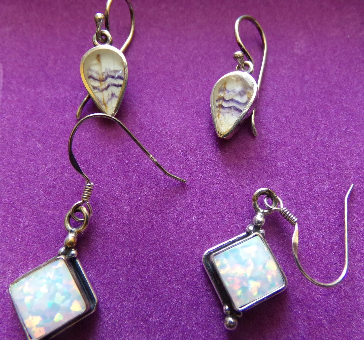 Pair of silver blue john set earrings + pair of silver opal style set earrings