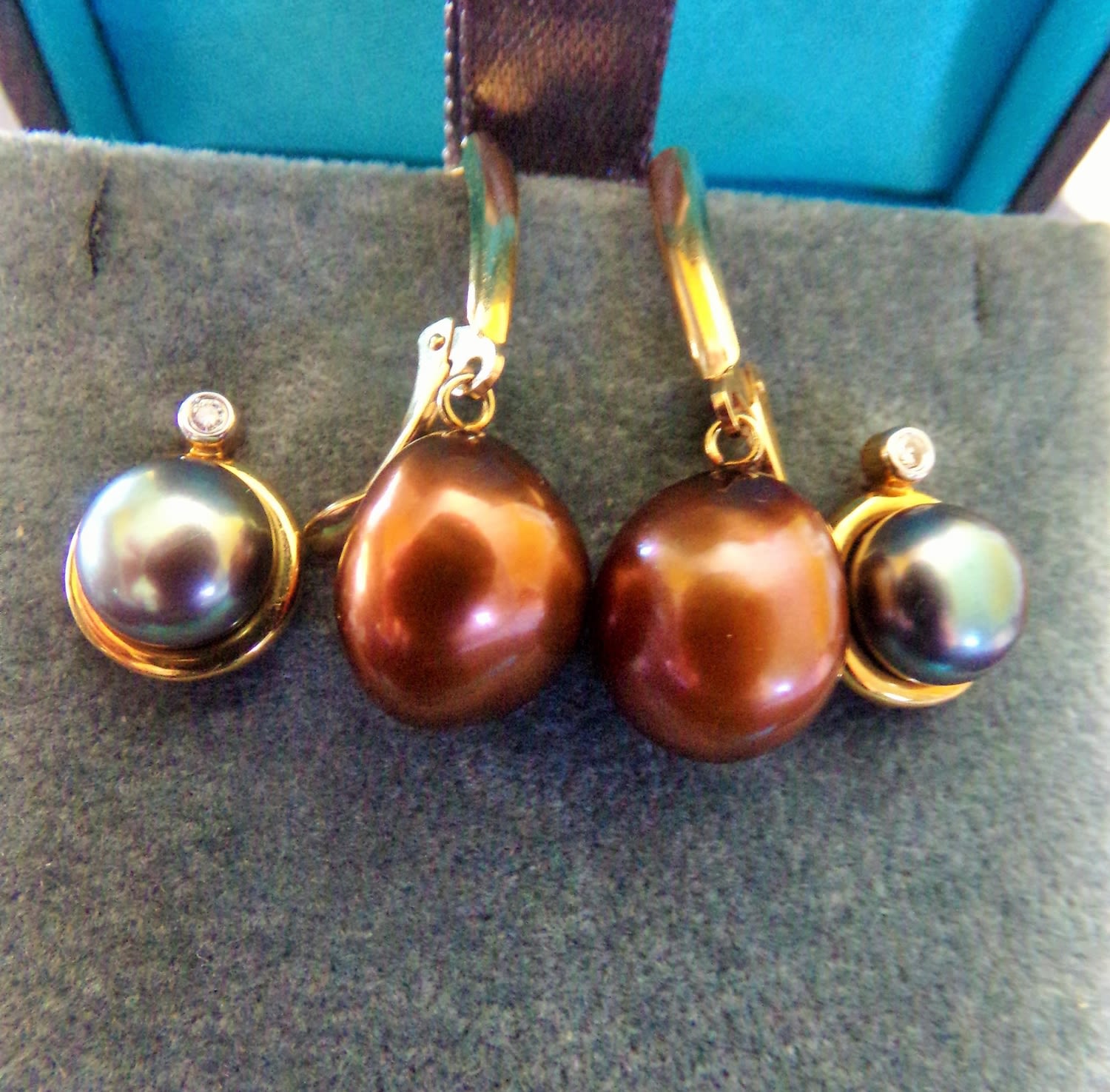 Pair of 14ct pearl style drop earrings + pair of 18ct pearl and small diamond stud set earrings
