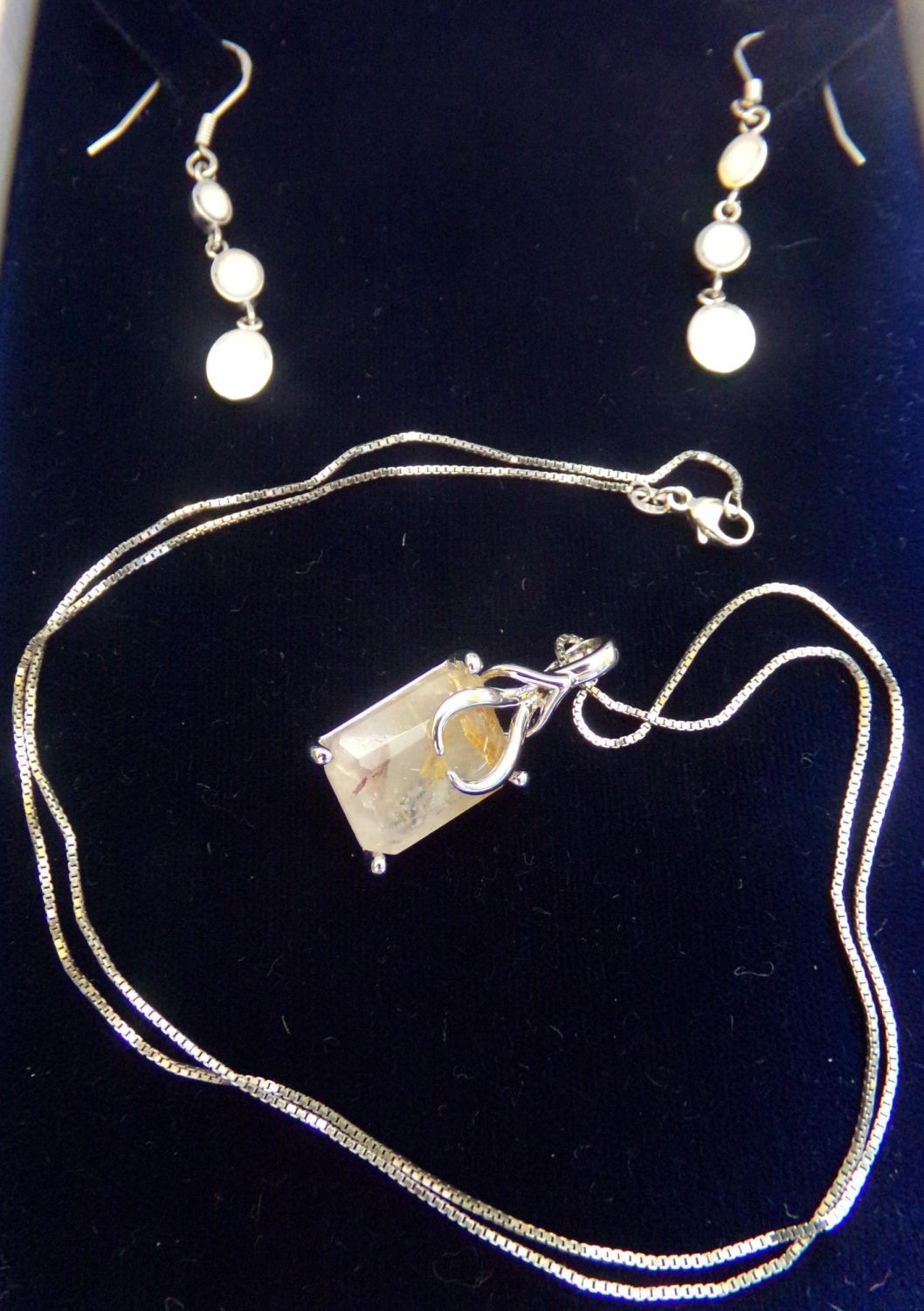 Silver faceted hardstone pendant on silver ( chain 20 OVERALL LENGTH )+ Pair of silver graduated drop earrings mounted in silver with opal centres .
