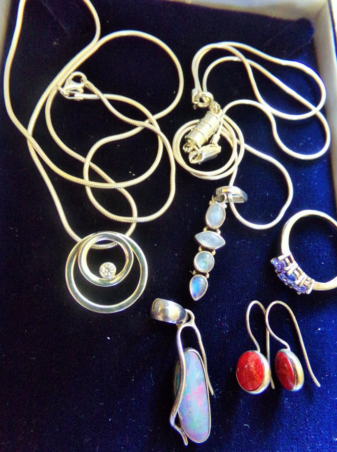 Silver Opal set pendant + 2 other silver stone se pendants on silver chains + silver stone set ring + pair of silver red stone set earrings