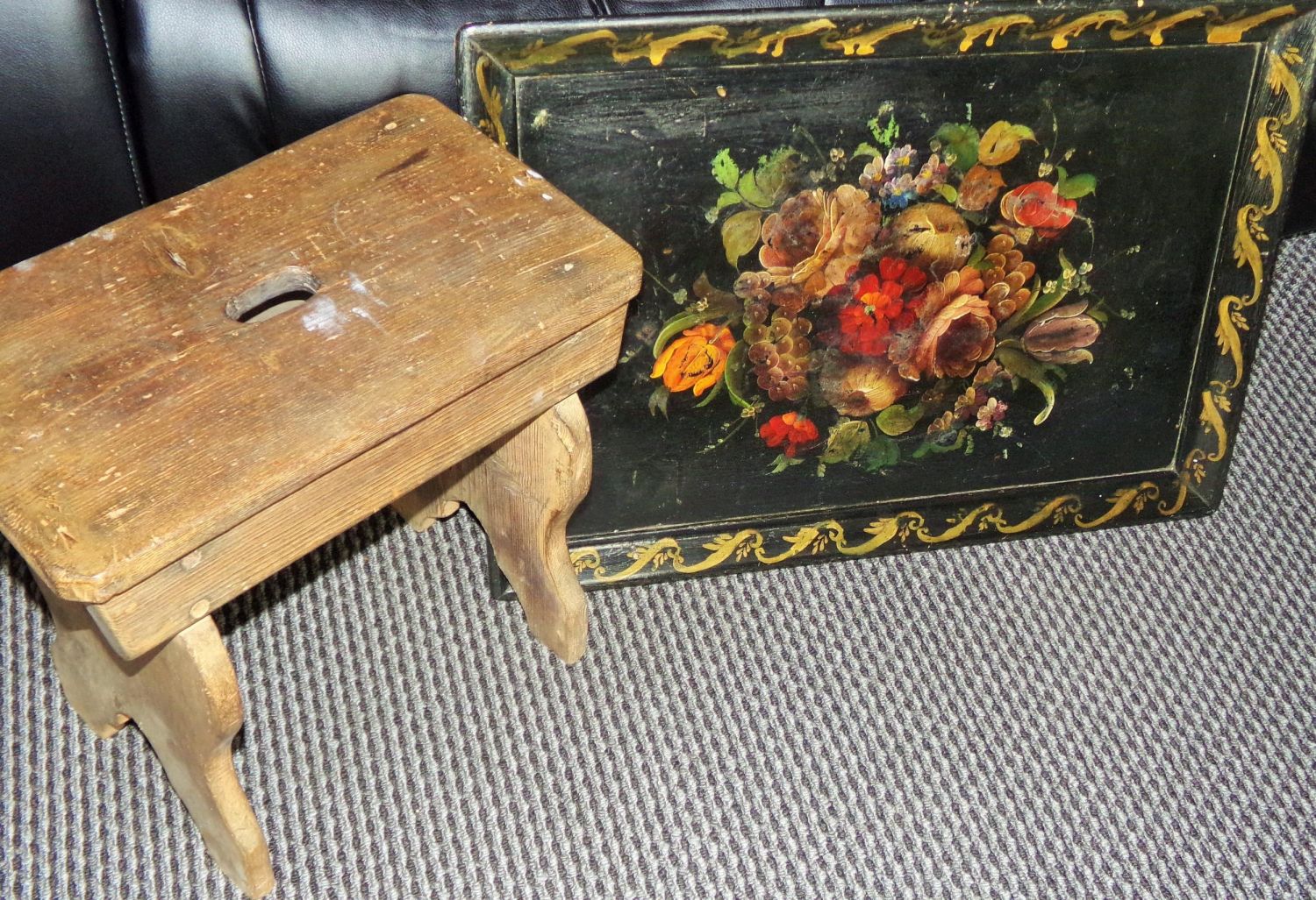Small late 19th early20th C scratch built stool with central carrying handle hole in seat on shaped legs 16x16x9.5 + large Victorian black lacquered &painted papier-mâché tray 26×19approx.
