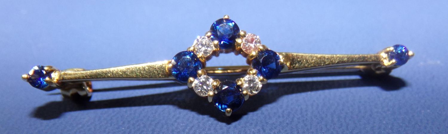 18ct fully hallmarked ladies pin brooch set with quality Diamonds and Sapphires on a central pierced mount with 2 smaller Sapphires on ends of brooch 0.2ct diamonds & 0.4ct sapphires approx. 4.5cm length