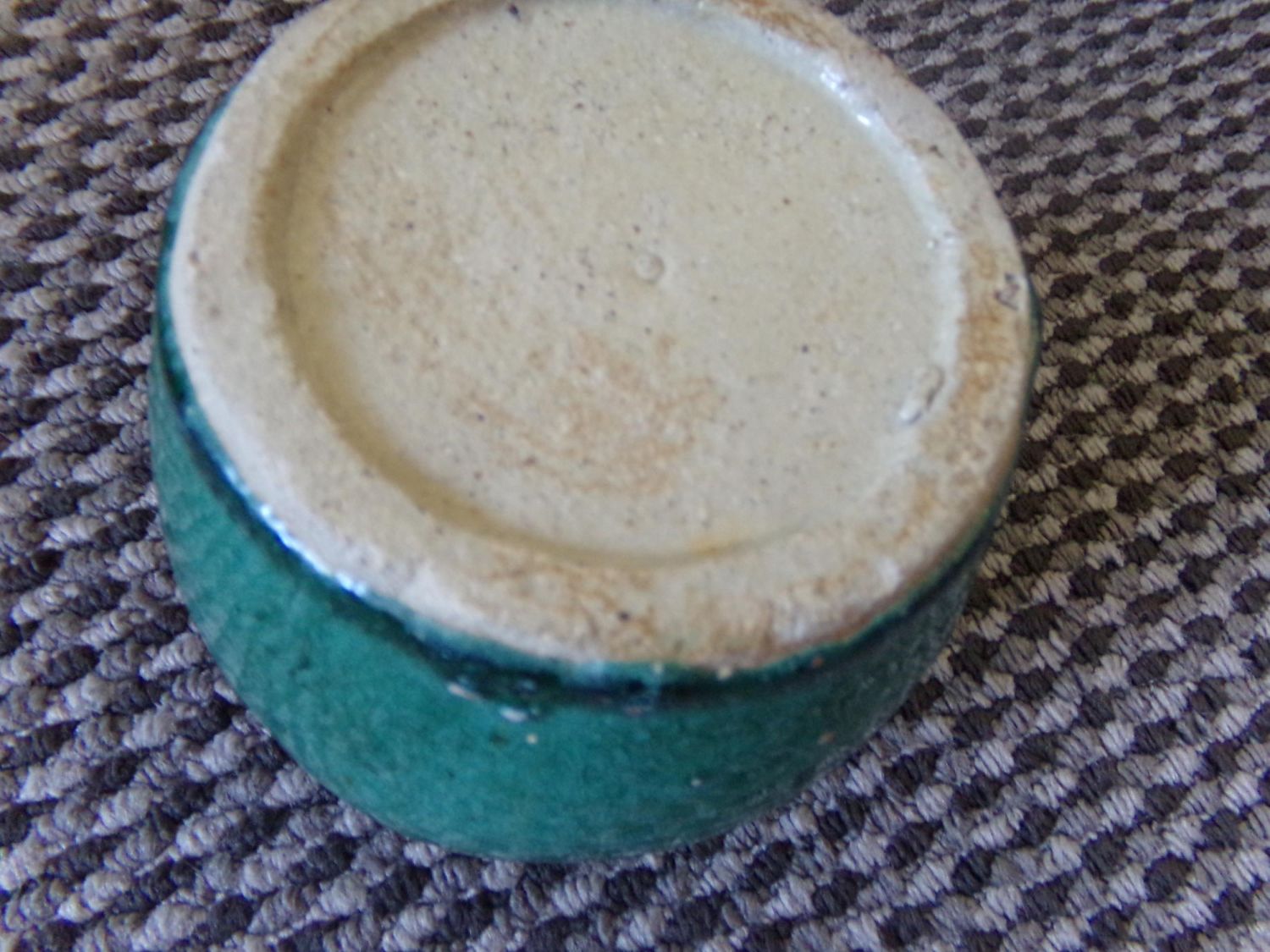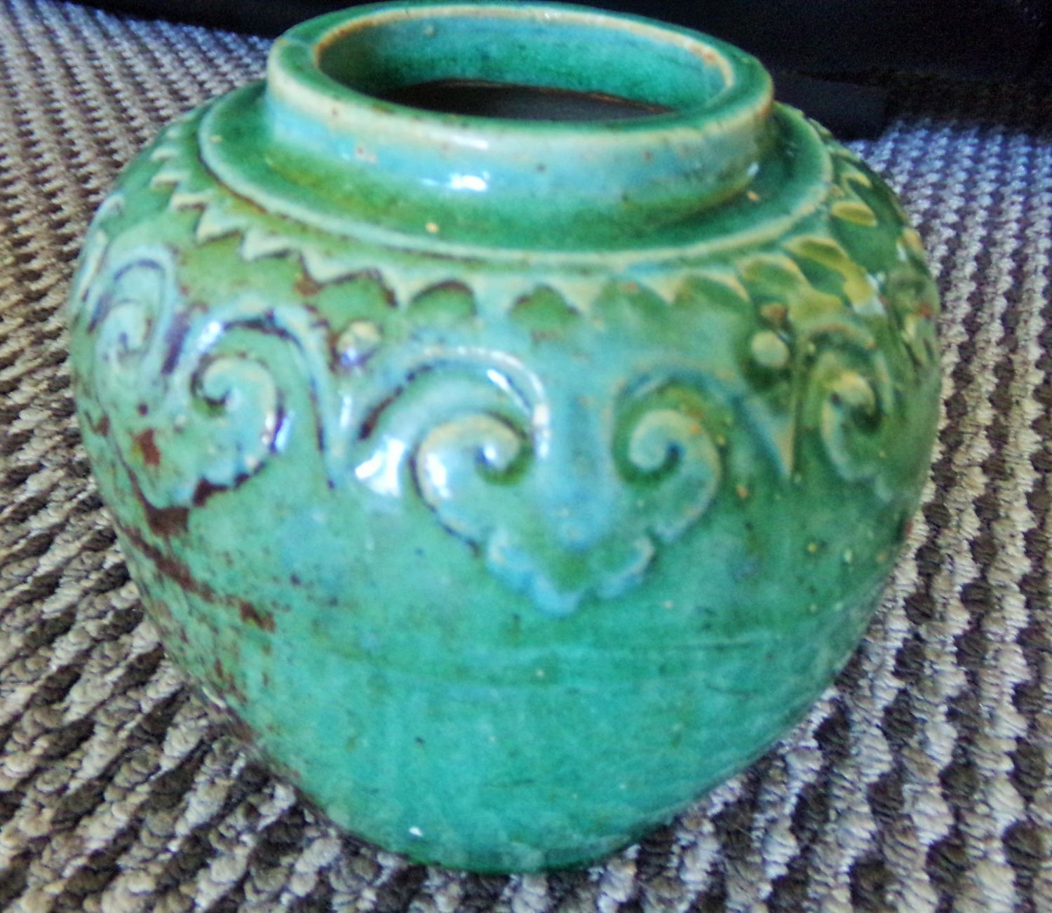 19th c Oriental thick green glazed earthenware pot with incised underglaze decoration to the rim ( possibly Chinese) 5high