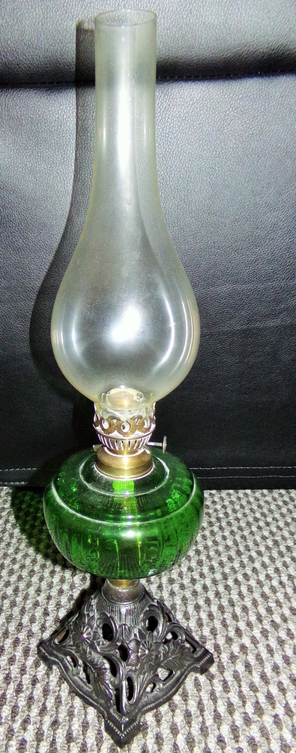 Victorian Cast Iron base Green Glass Oil Lamp C1890