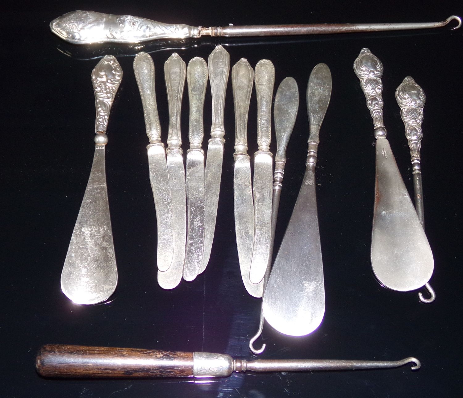 Good selection of antique silver handled shoe horns lace pullers, knives + ebony handle lace puller with silver collar (13)