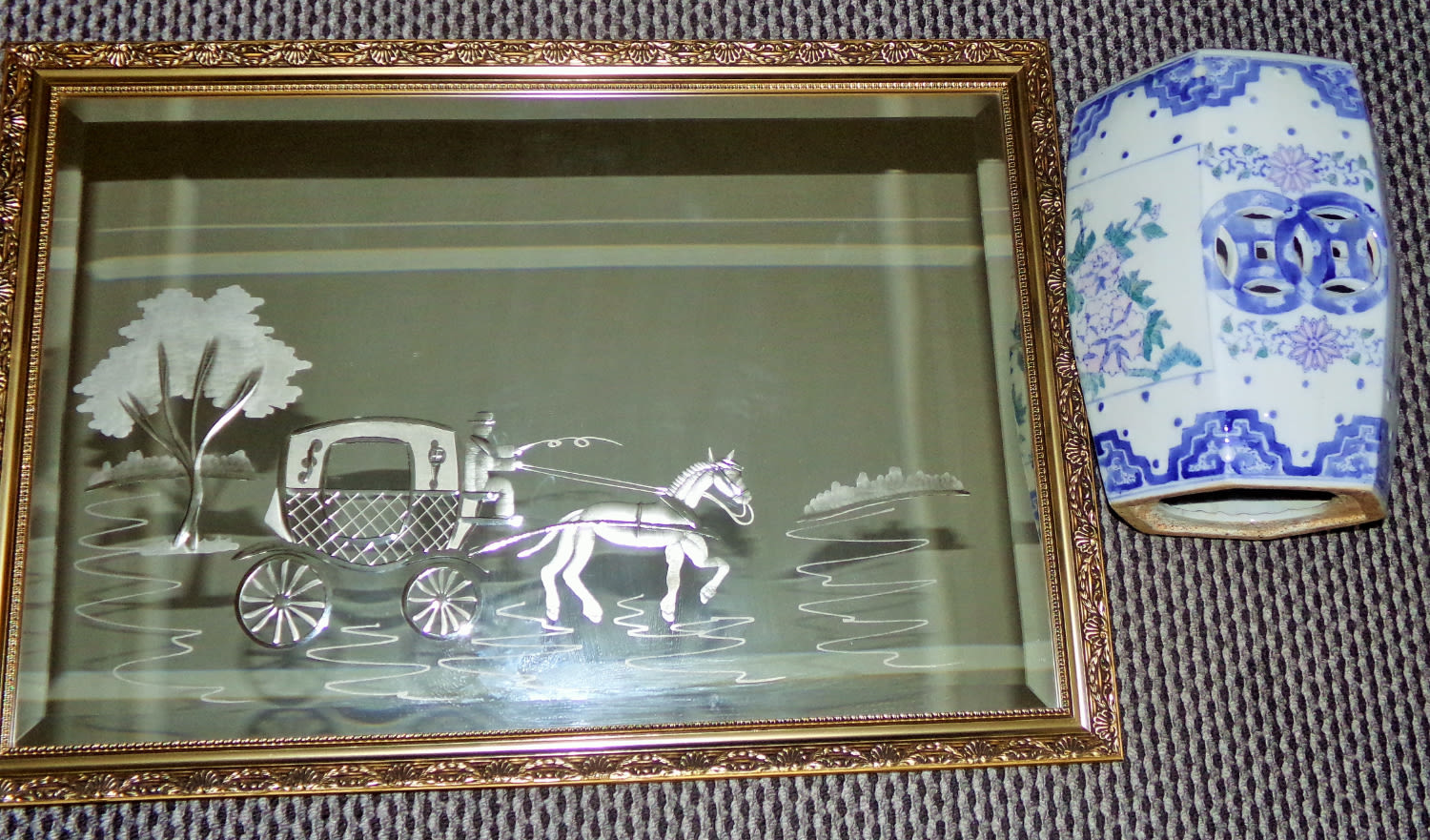 Large reverse etched mirror 33×23 + oriental style pottery blue/white seat 12” high 8.5” diameter
