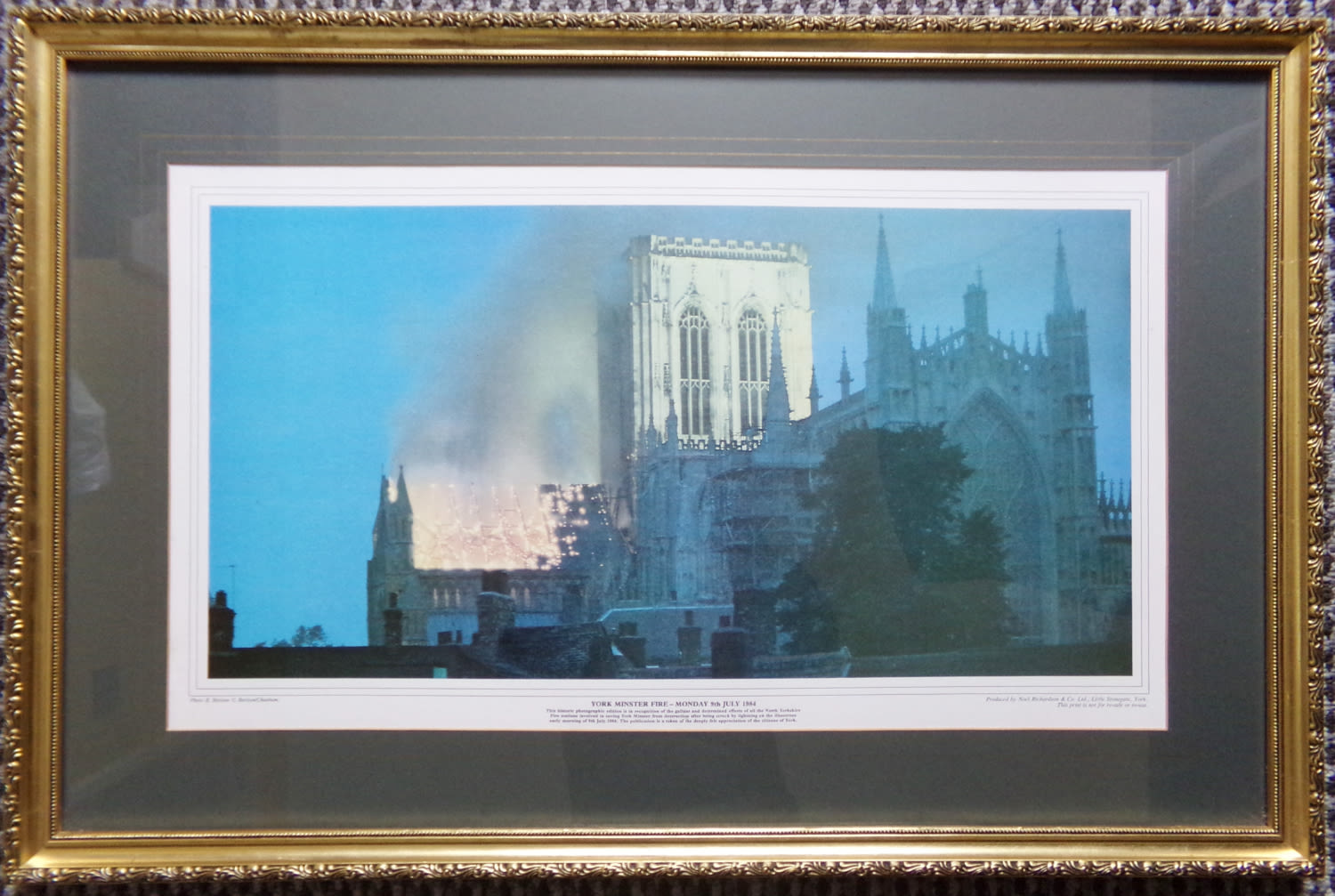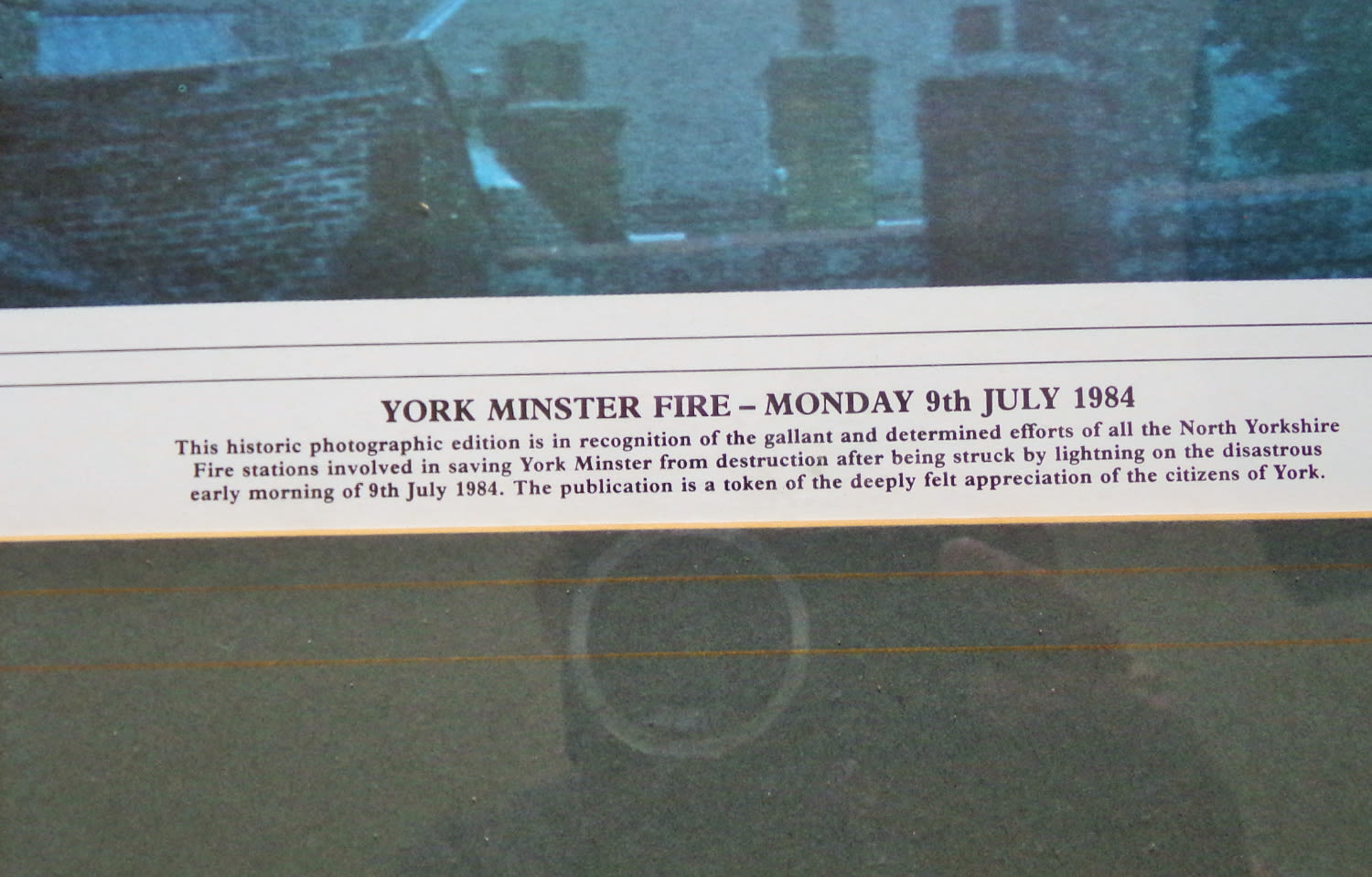 Framed and glazed Historic photographic addition print of The Fire at York Minster 9th July 1984 presented to all North Yorkshire Fire station in appreciation of their gallant efforts ( written on reverse A Horner Acomb Fire Station 20×30”