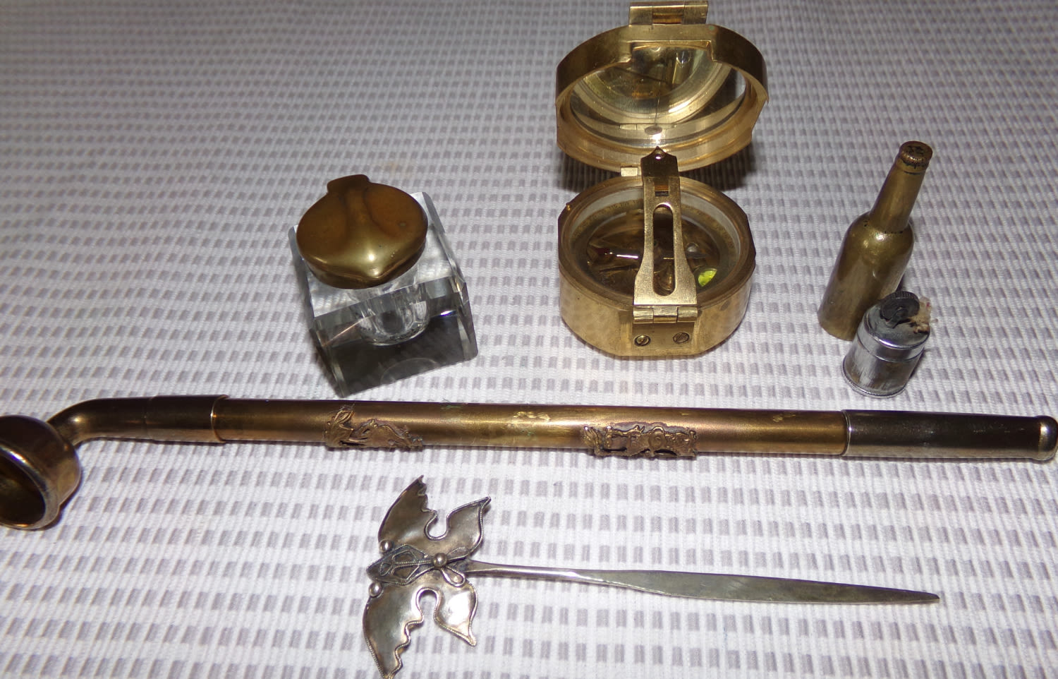 Mixed selection inc faceted glass inkwell with brass top + vintage oriental style extending copper smoking pipe + small bottle shaped cigarette lighter+ unusual white metal skewer with bat shaped handle + Vintage Stanley Of London brass Surveying Sighting Compass Natural Sine 3″ diam.