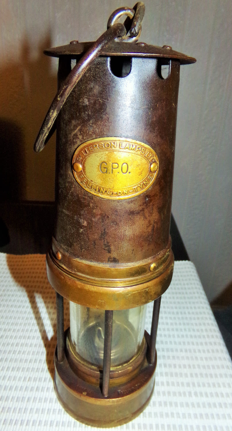 A GPO marked Miners Lamp. Black painted body with brass fittings. Brass badge marked GPO Patterson lamp ltd Felling on Tyne 9.5” approx.