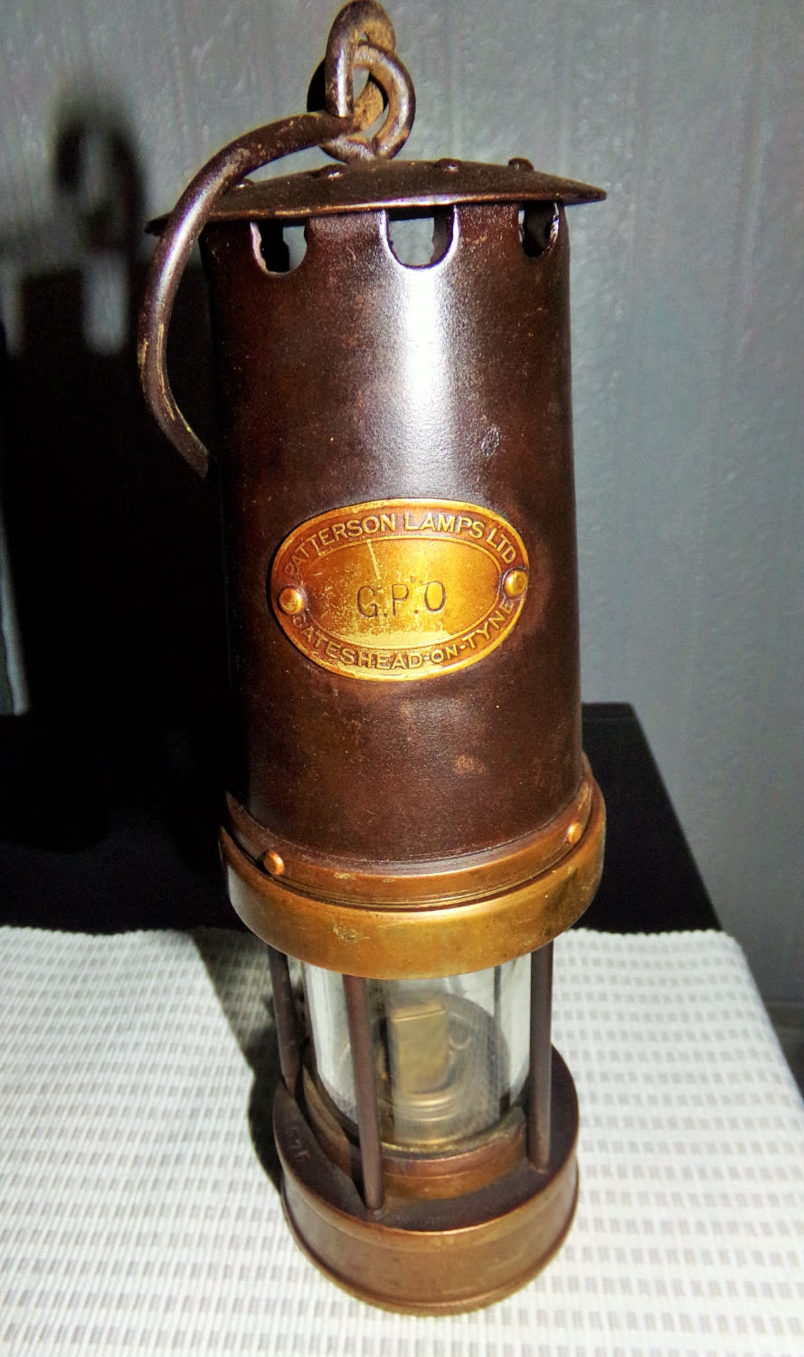 A GPO marked Miners Lamp. Black painted body with brass fittings. Brass badge marked GPO Patterson lamp ltd Gateshead on Tyne 9.5” approx.