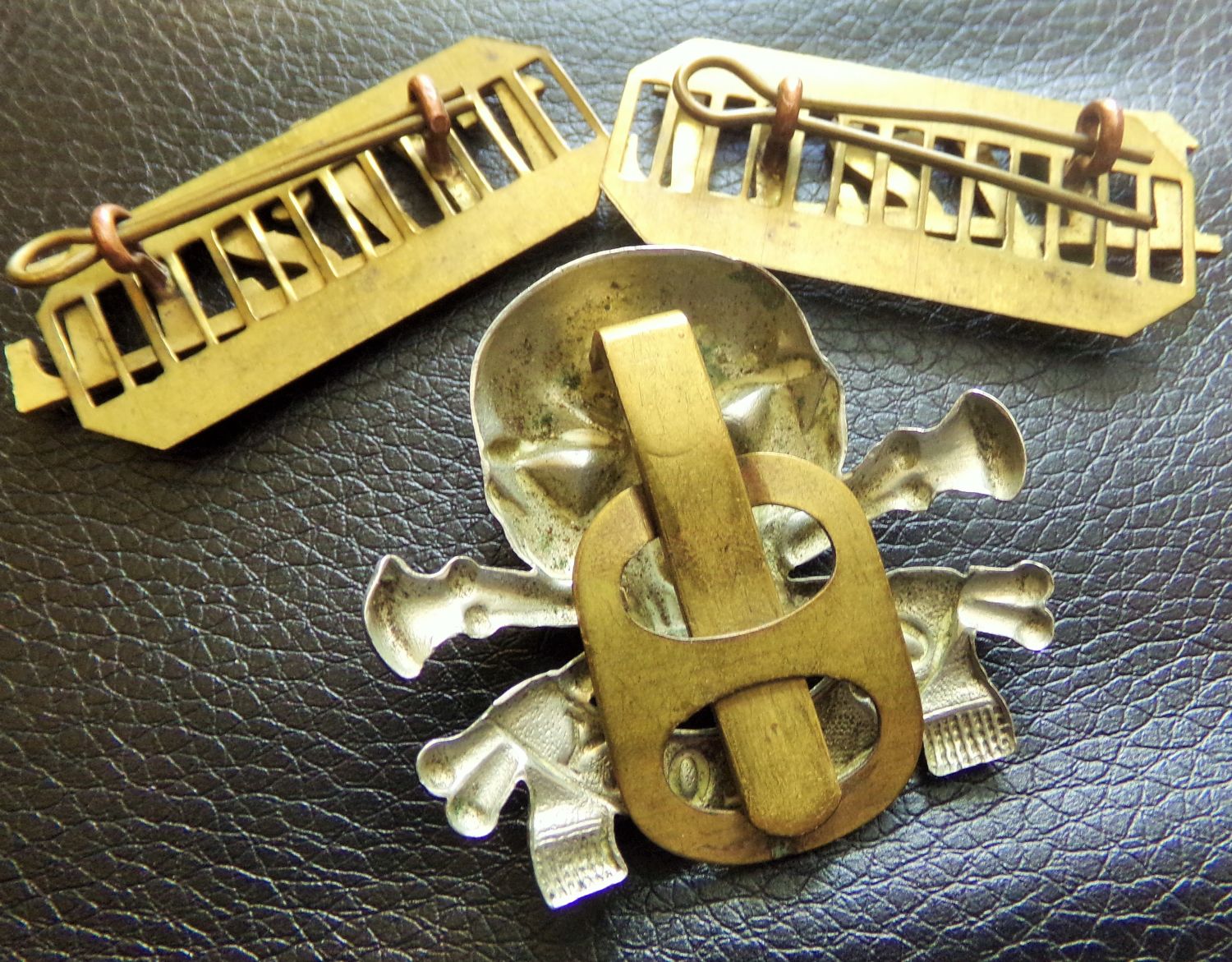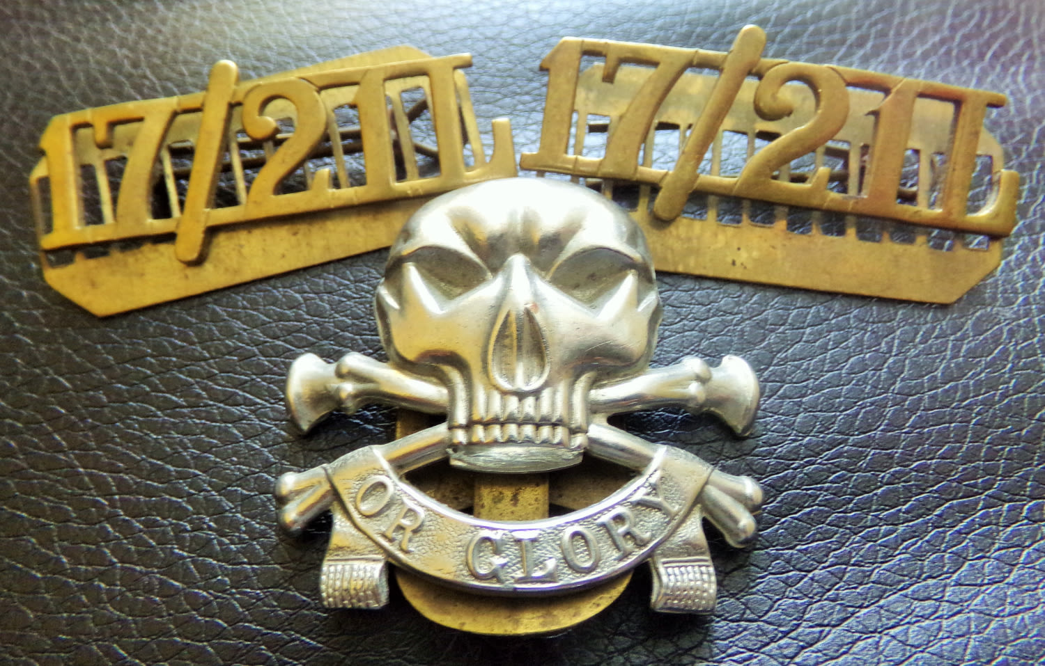 Set of brass 17/21st lancers shoulder title badges + Lancers death or Glory skull and crossbones officers cap badge