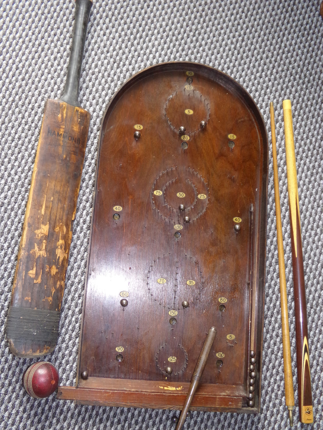 Vintage S classic 2 piece snooker cue + Nicolls Hammond autograph cricket bat & ball + Vintage bagatelle game with ball bearings and wooden plunger