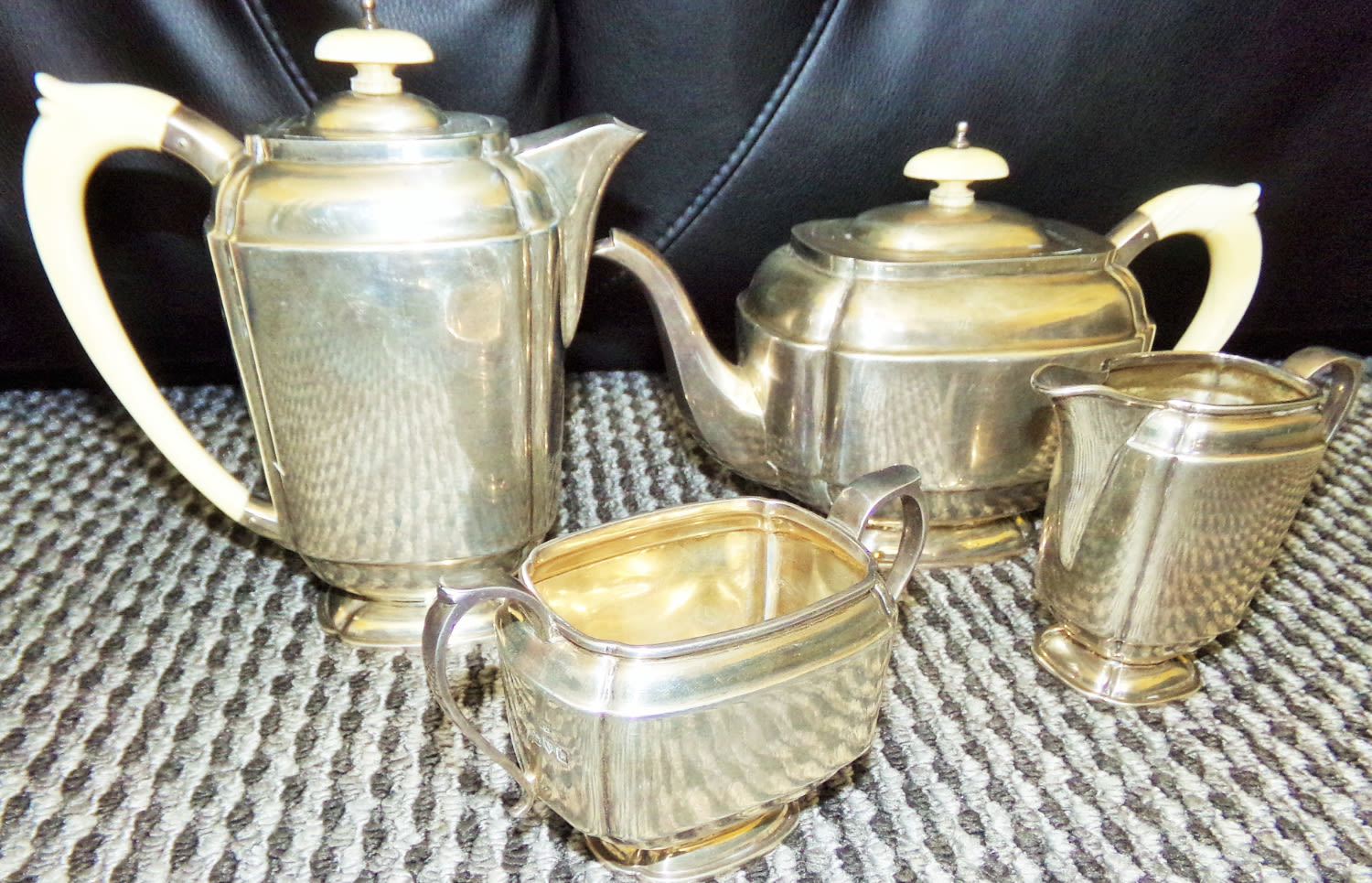 Art Deco Silver tea set , tea pot hot water jug , sugar and milk jug 1563g approx. Chester 1936 S Blanckensee