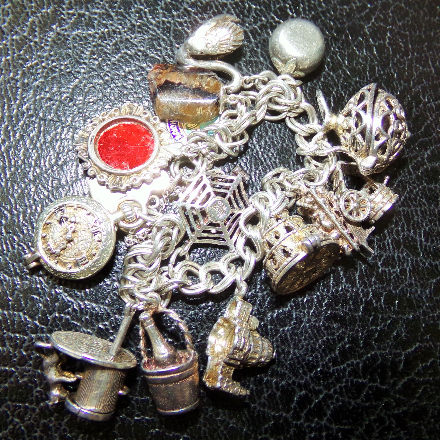 Very unusual silver charm bracelet marked silver comprising of various charms Inc. cart , swan, champagne bucket, cat in a bin spider on web + very unusual Victorian 1836 silver 3d coin forged into a button shaped charm 58.8g approx.