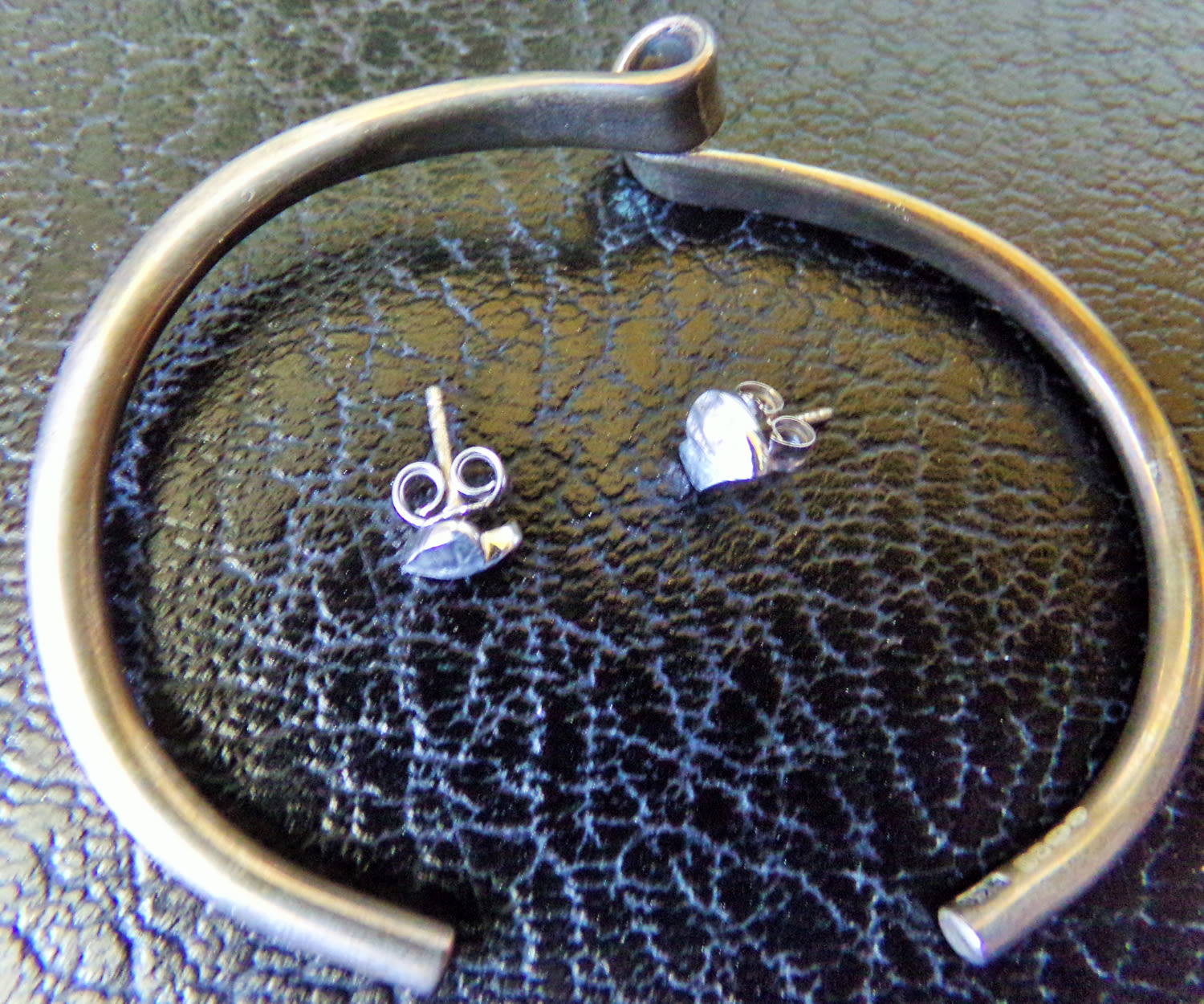 Pair of silver heart shaped earrings and a ladies silver twisted bangle 15.6 g approx.