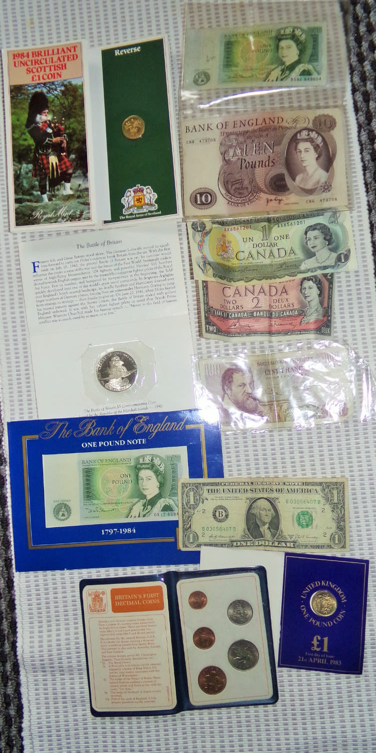1960s old Bank of England Ten pound note prefix C86 473708 + 2x old one pound bank note + American & Canadian 1 dollar bank notes ,Canadian 2 dollar note + French 100 frank bank note + Battle of Britain 5 dollar coin + Scottish & British £1 coin , decimal set etc.