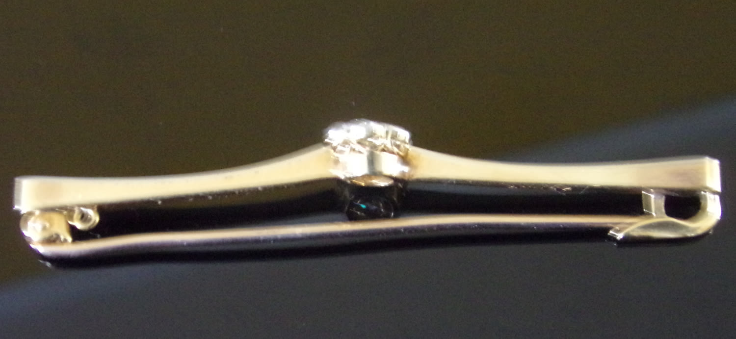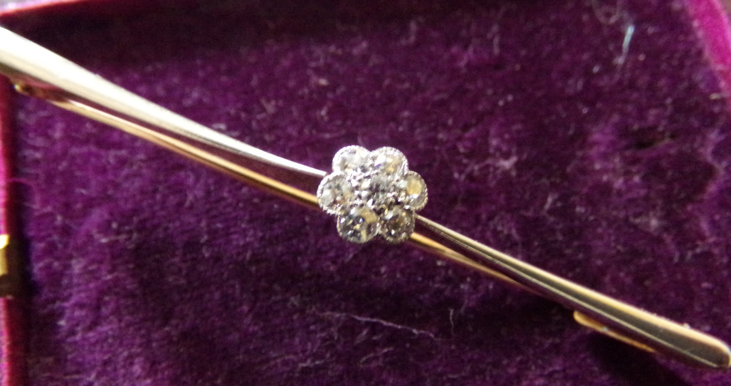 An Edwardian diamond and 14ct gold bar brooch, comprising a central diamond set flower cluster, diamond weight approx 0.20ct, to a tapered platinum topped bar, length approx 60mm, gold reverse, total gross weight approx 4.3gms details: good- minor wear and tear slight bend on pin commensurate with age