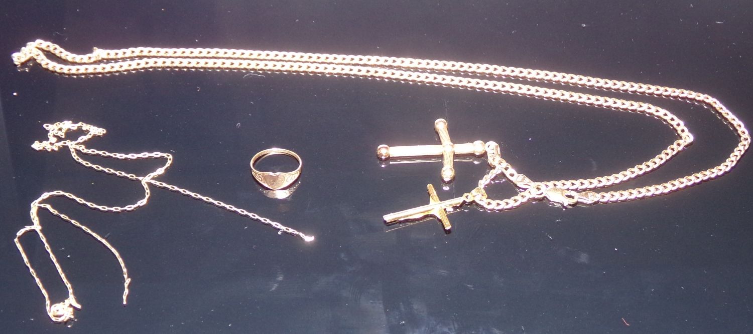 9ct gold chain with 2x 9ct gold crucifix + thin 9ct gold chain (broken) + child’s 9ct gold signet ring 9g approx.