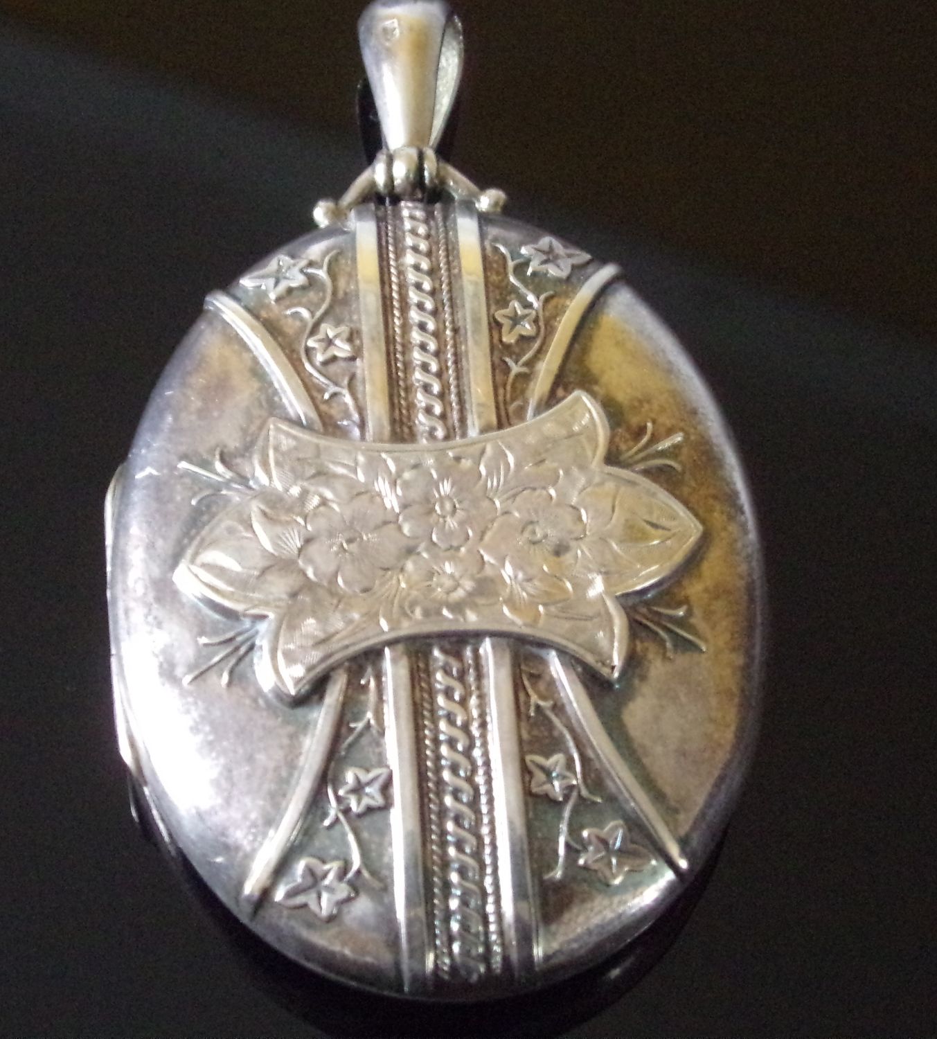 Ornate antique large silver locket with ornate raised decoration & cartouche 22.8g approx. 5x4cm approx.