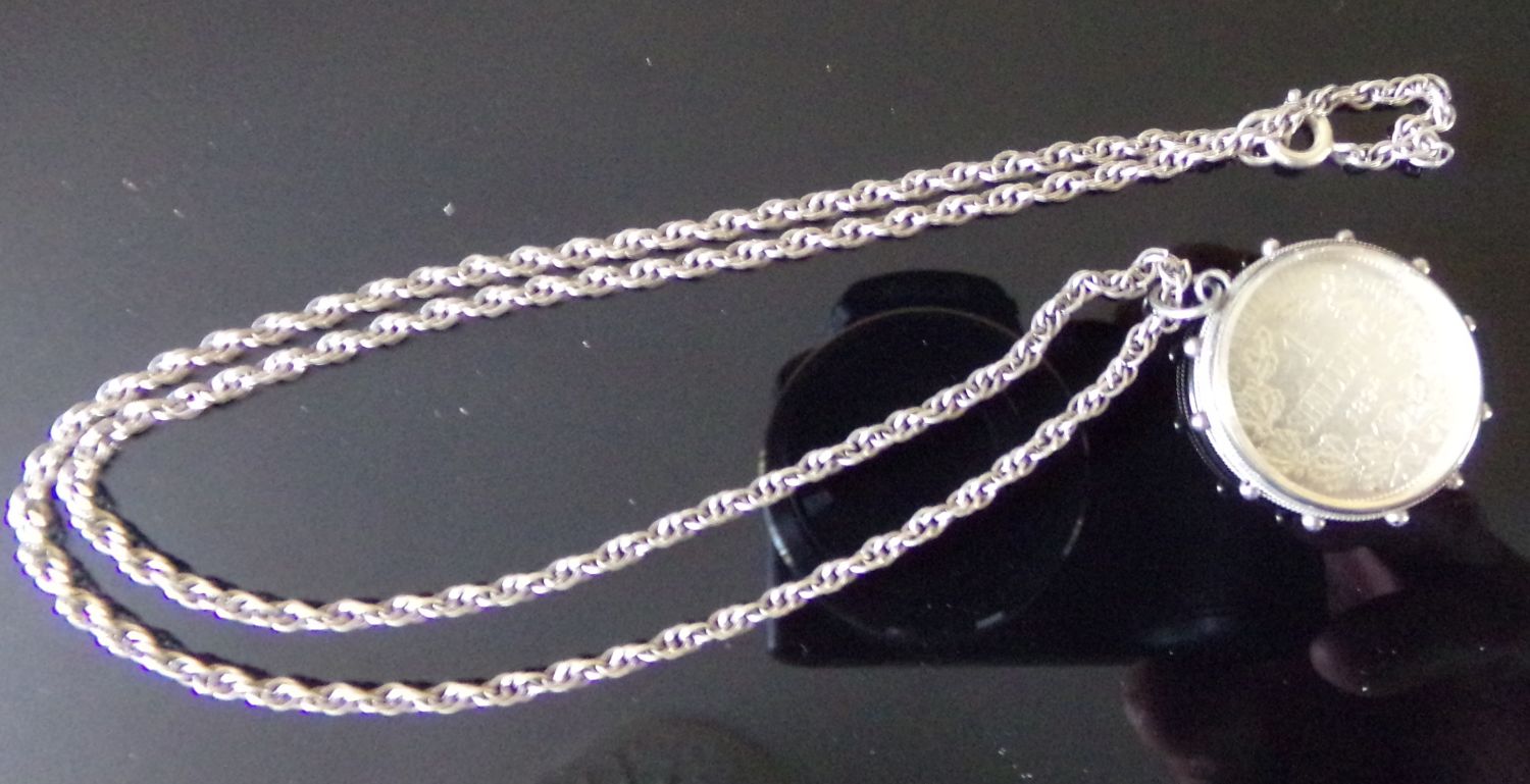 Unusual silver open sided pendant with glass panels encompassing a 1894 Z Afrika 1 shilling coin on silver chain
