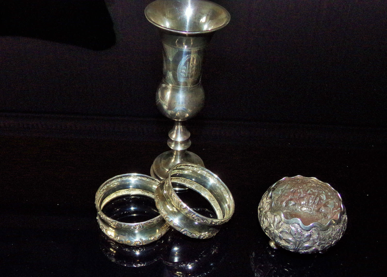 Pair of nicely engraved circular napkin rings Birmingham 1910 Crisford & Norris + small 11cm silver stem vase London 1921 with engraved decoration 49.3g + Indian Kutch style white metal salt with repousse decoration depicting a small hut in forest with hunting dog approx.