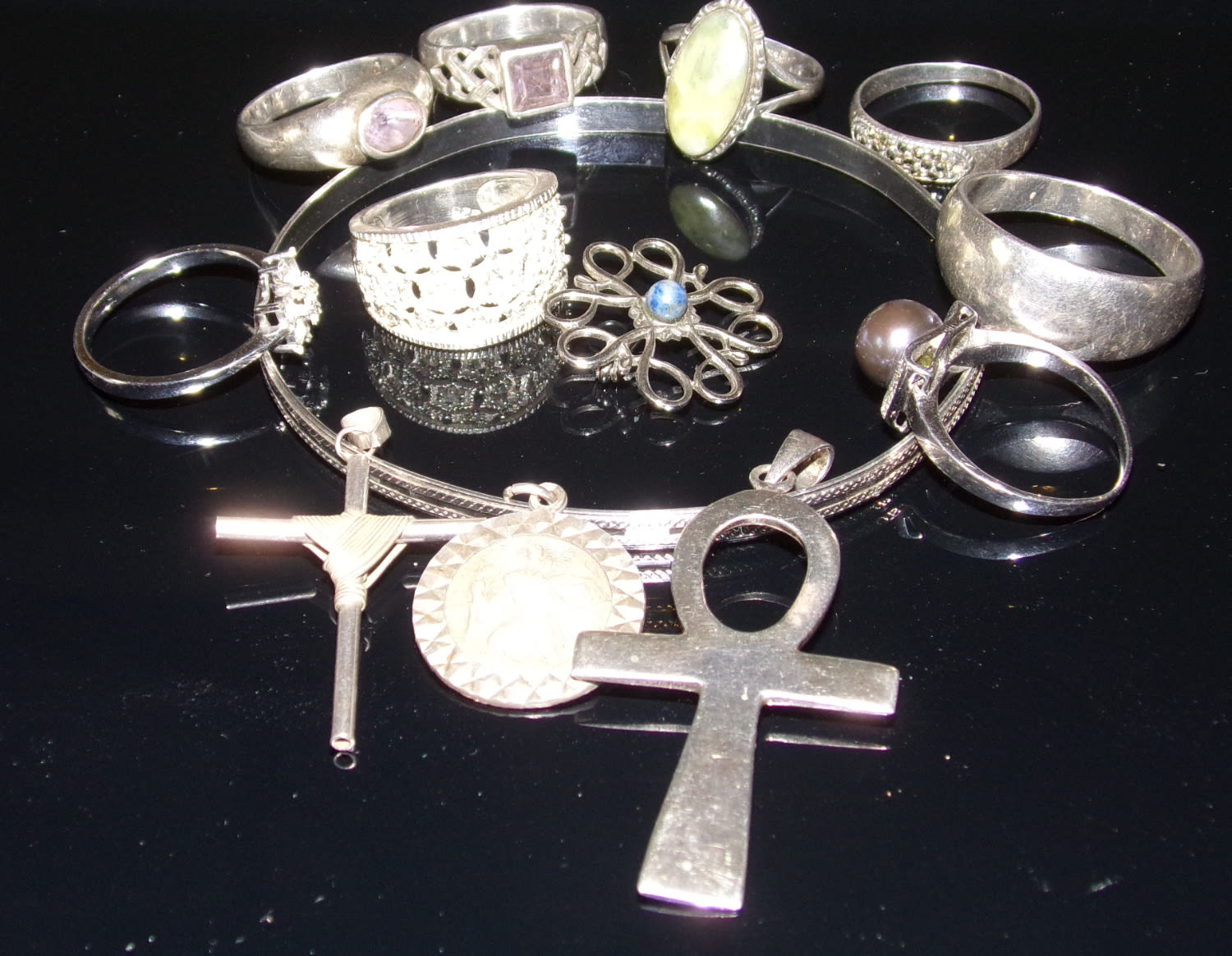 Good selection of silver Inc. .7 x silver Rings 1x bangle 2x crucifixes 1xbrooch 1x St Christopher 42.8g approx.