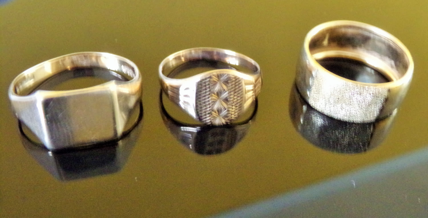 9ct gold band +Ladies & Gents 9ct gold signet rings 7.2g approx. (3)