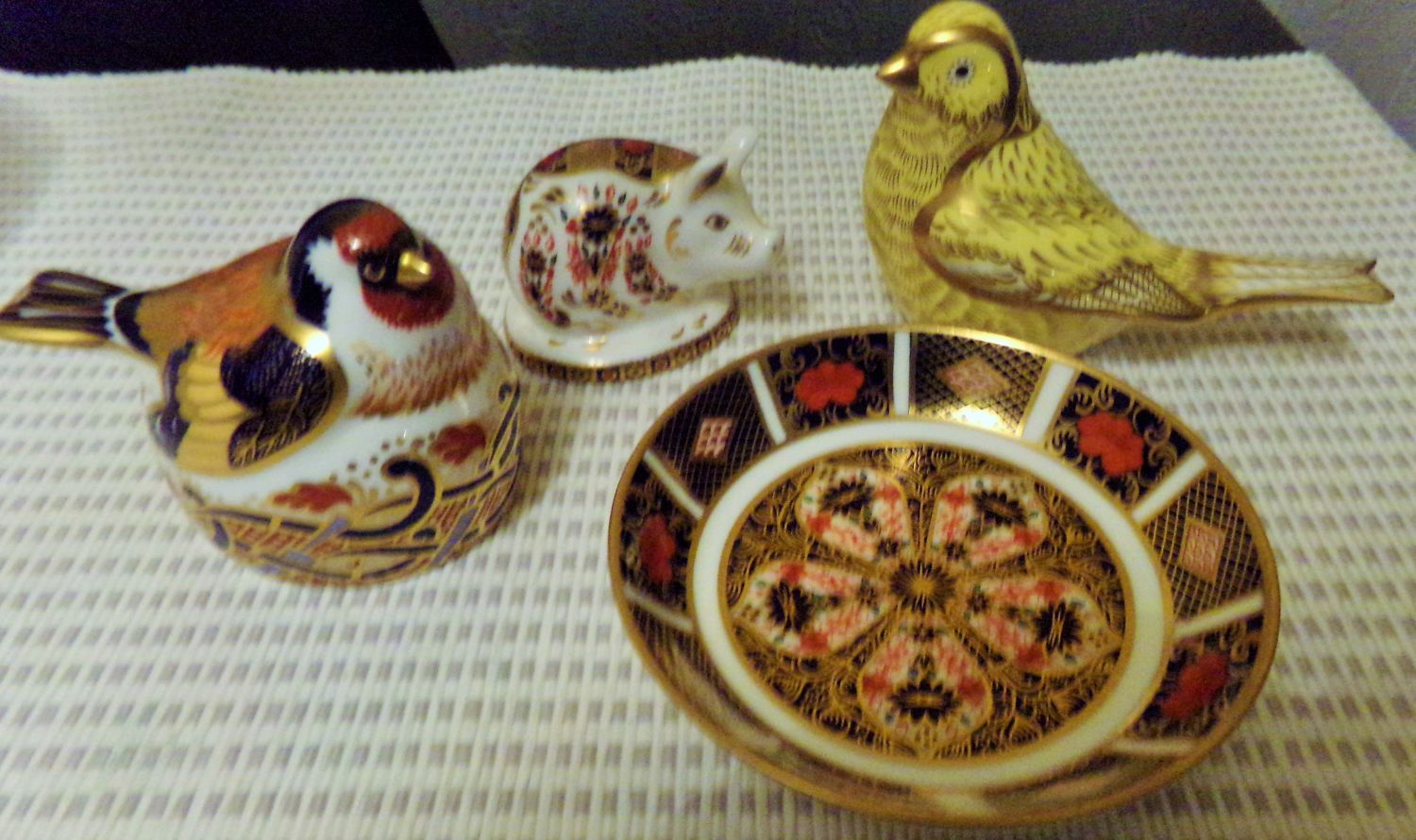 Royal Crown Derby Paperweight goldfinch nesting,+ Royal Crown derby Canary paperweight + pig paperweight + 4” approx. Royal Crown derby old imari pin dish ( second)