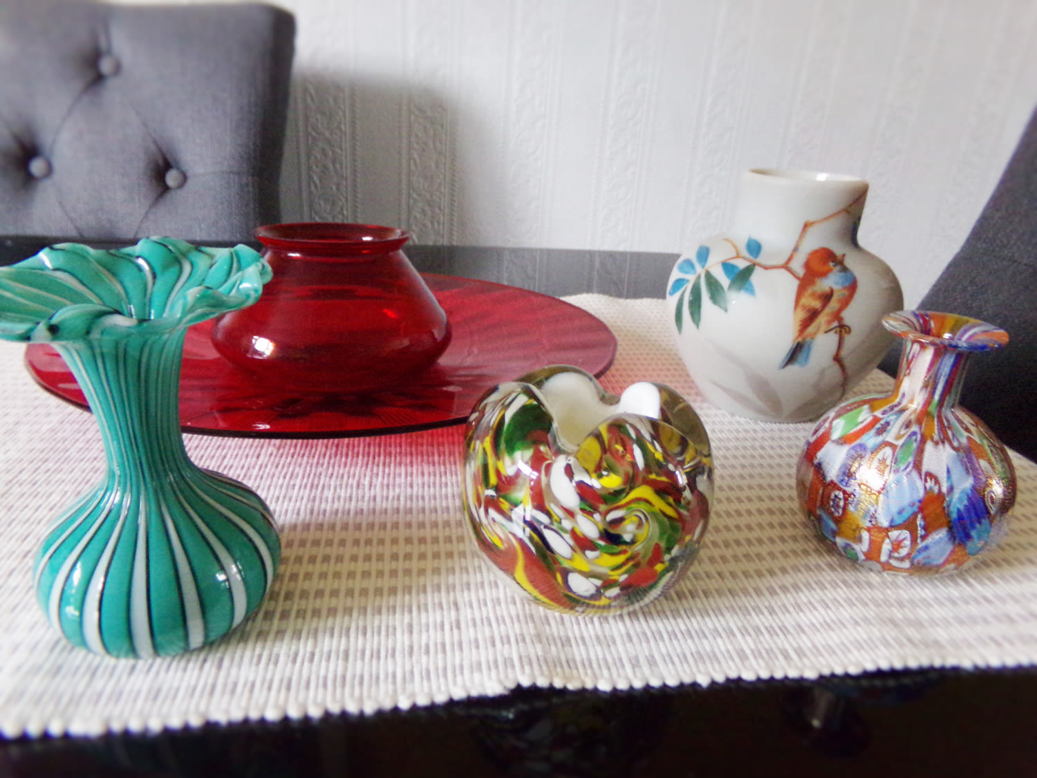 Good selection of art glassware inc ruby glass centre piece tazza and bowl , Tazza with ribbed underside decoration ,Green & White candy twist hand blown Murano vase with flared top ( bearing original label ,Vintage Murano millefiori bottle vase ,Hand blown & hand painted vase with bird in tree branches , millefiori style double overlay handmade inkwell with multicolour outside and white inner
