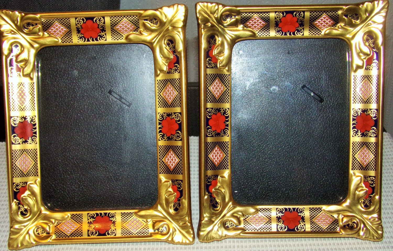 Pair of Royal Crown derby solid gold band old Imari photo frames (No strike through mark sold to client as seconds) 18.5 x23.5cm approx.