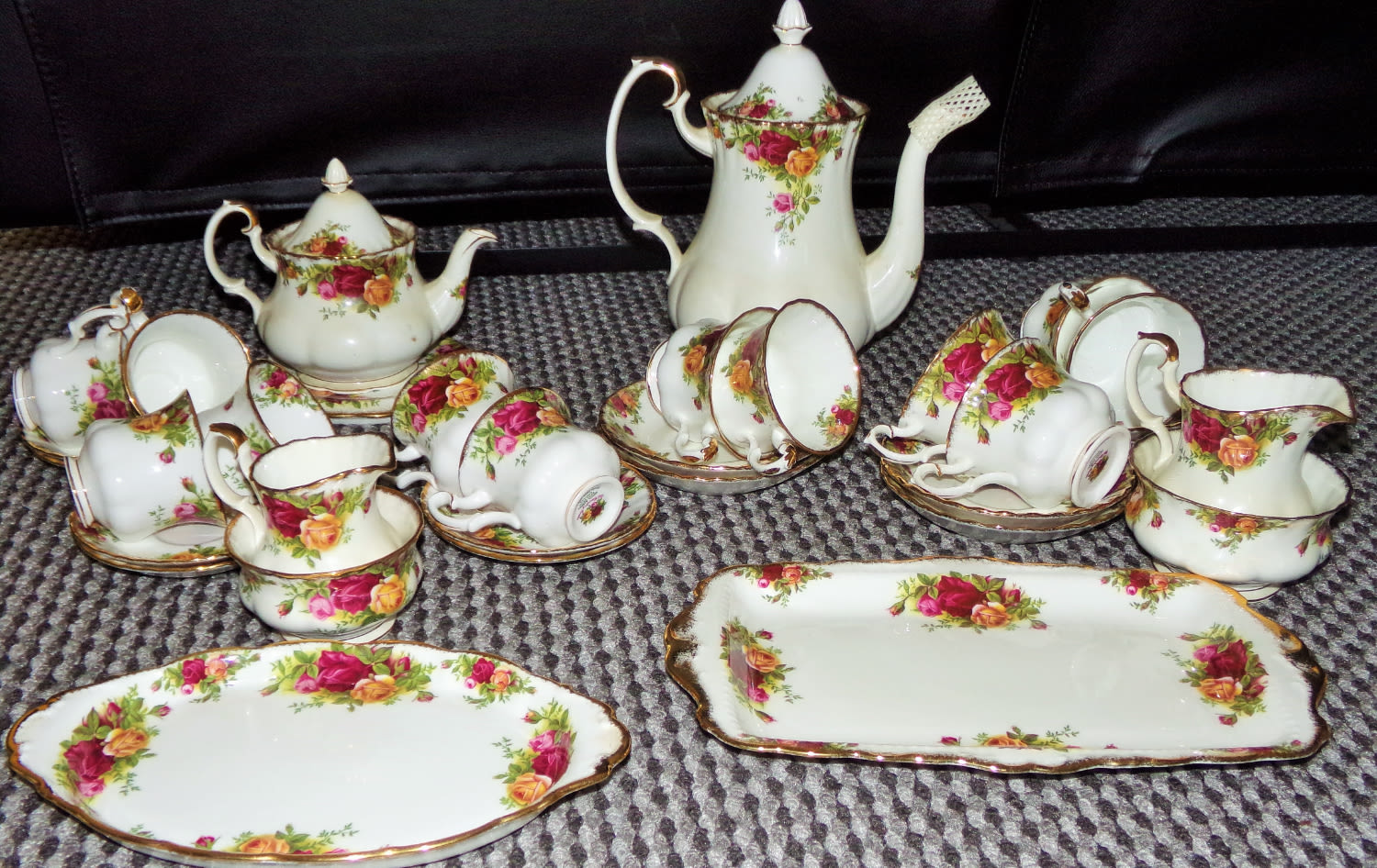 Good selection of Royal Albert Country Roses , Tea set for 6 & Coffee set for 6 both Inc. sugar and milk jugs + 2 cake plates, tea pot stand ( 33)