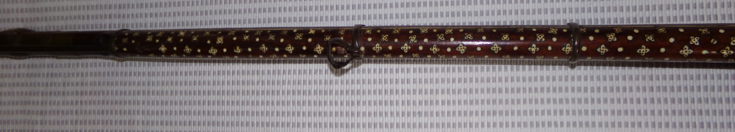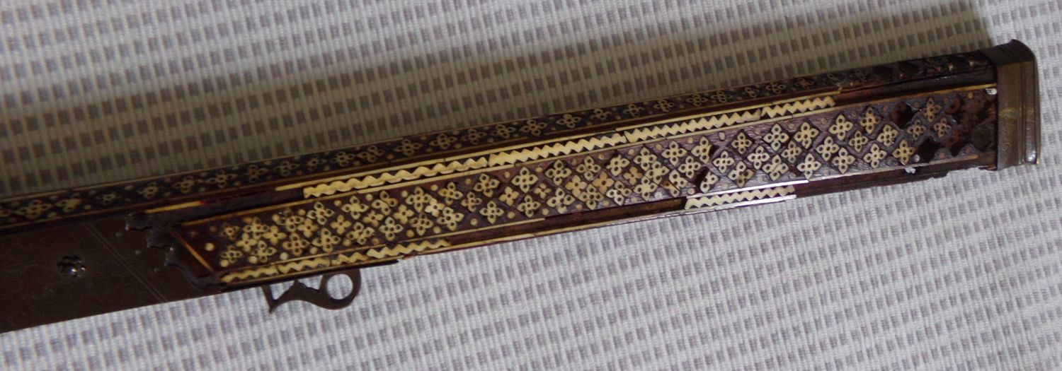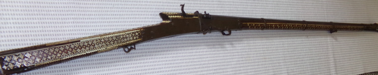19th century inlaid middle eastern flintlock rifle/ musket. ( missing inlay on stock and crack in wood under barrel 52” approx. bower