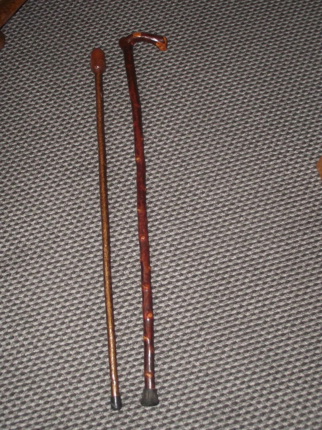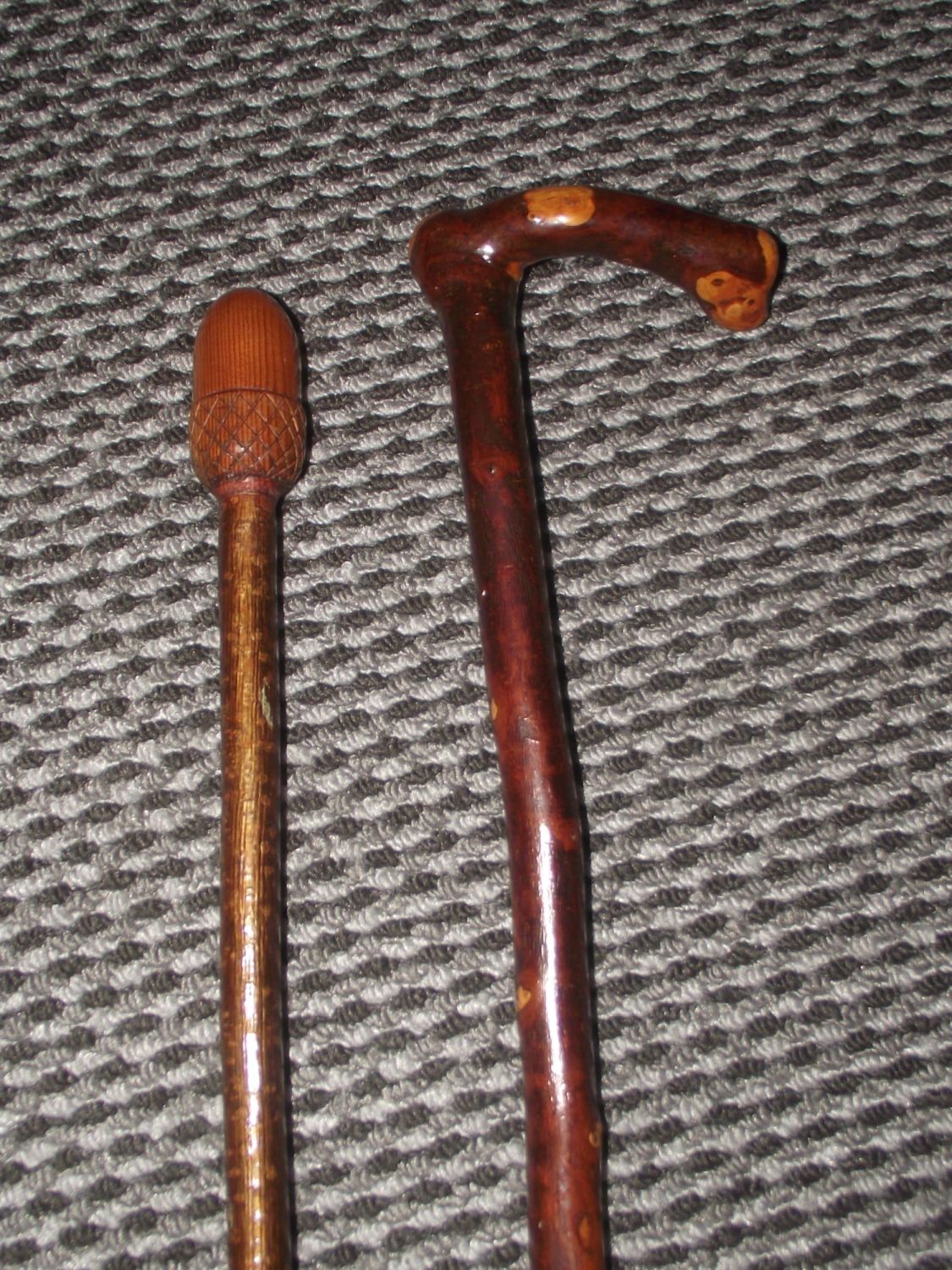 2x Hawthorne style vintage walking sticks. One with carved knurled wood handle and the other with a hand carved acorn finial handle