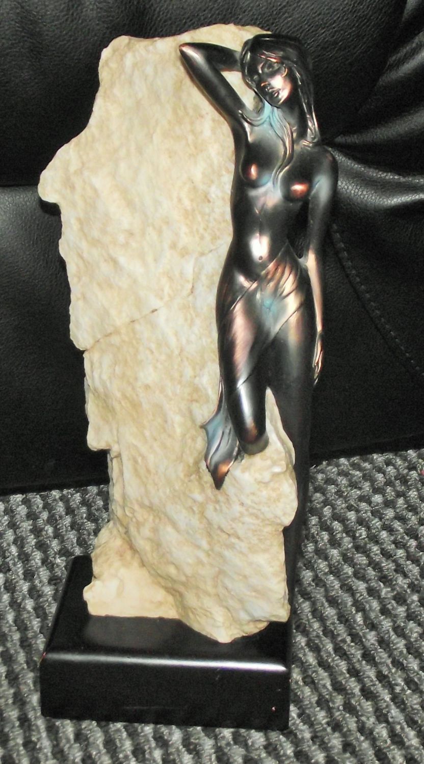 Vintage Hand Painted bronzed Marka Gallery Hand Painted Statue Of A Nude Woman Fused Within A Stone Wall. Original label to base