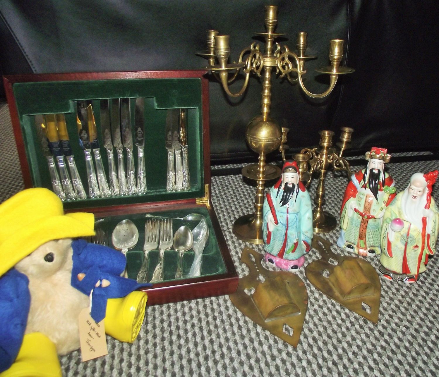 Mixed lot Inc. Canteen cutlery , Padding bear, 2x brass 4 branch candelabras , 3 pottery oriental style figures 2x brass wall candle holders etc