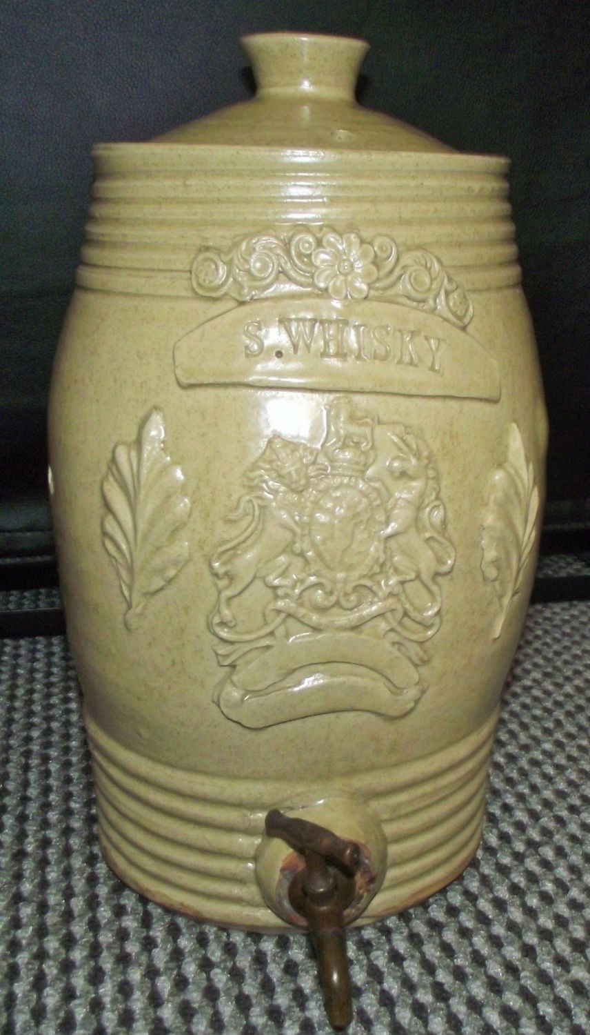 Lovely Victorian salt glazed Whiskey barrel marked S Whiskey with coat of arms to front ( slight bubble glaze loss to glaze on one side )