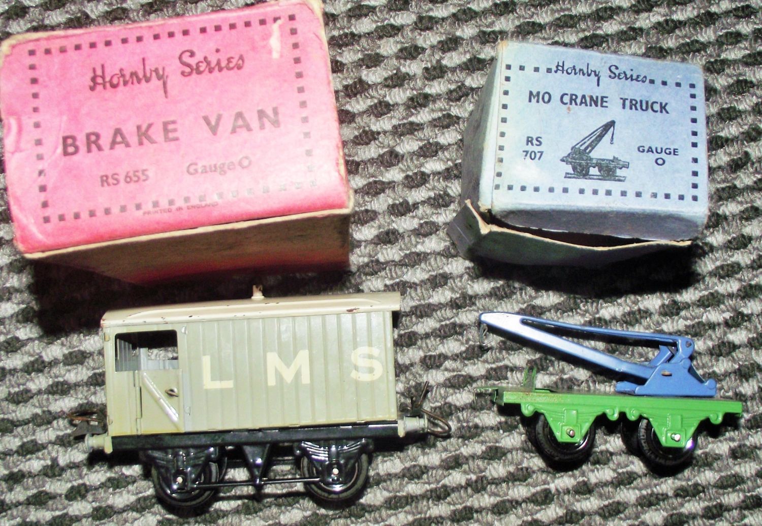 Rare LMS O gauge tin plate brake van + Hornby O gauge MO crane truck both good condition in original boxes k