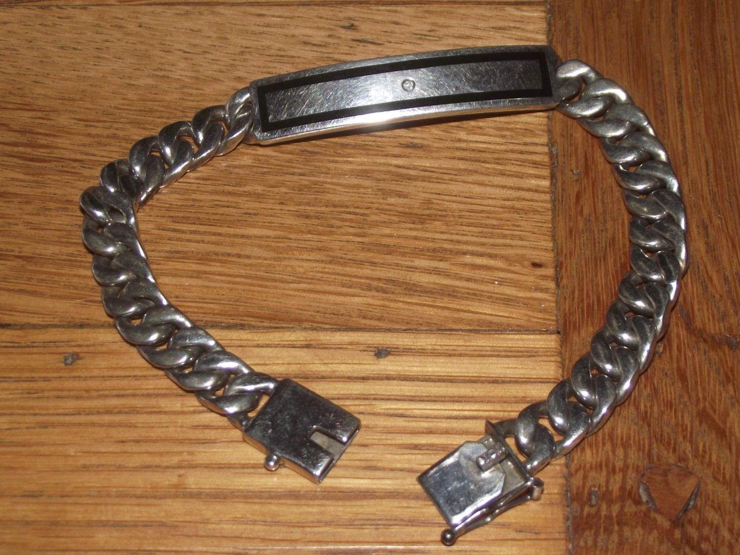 Nice quality gents silver identity curb bracelet with small central diamond. 51g approx.