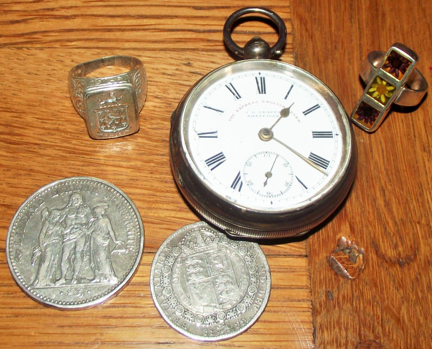Silver cased key wind express English lever pocket watch 1874 ( not seen working ) + 1889 VICTORIA SILVER HALF CROWN + 1968 SILVER 10 Francs + silver seal ring set with heraldic coat of arms & silver ring set hand painted flowers in a resin setting . (4)