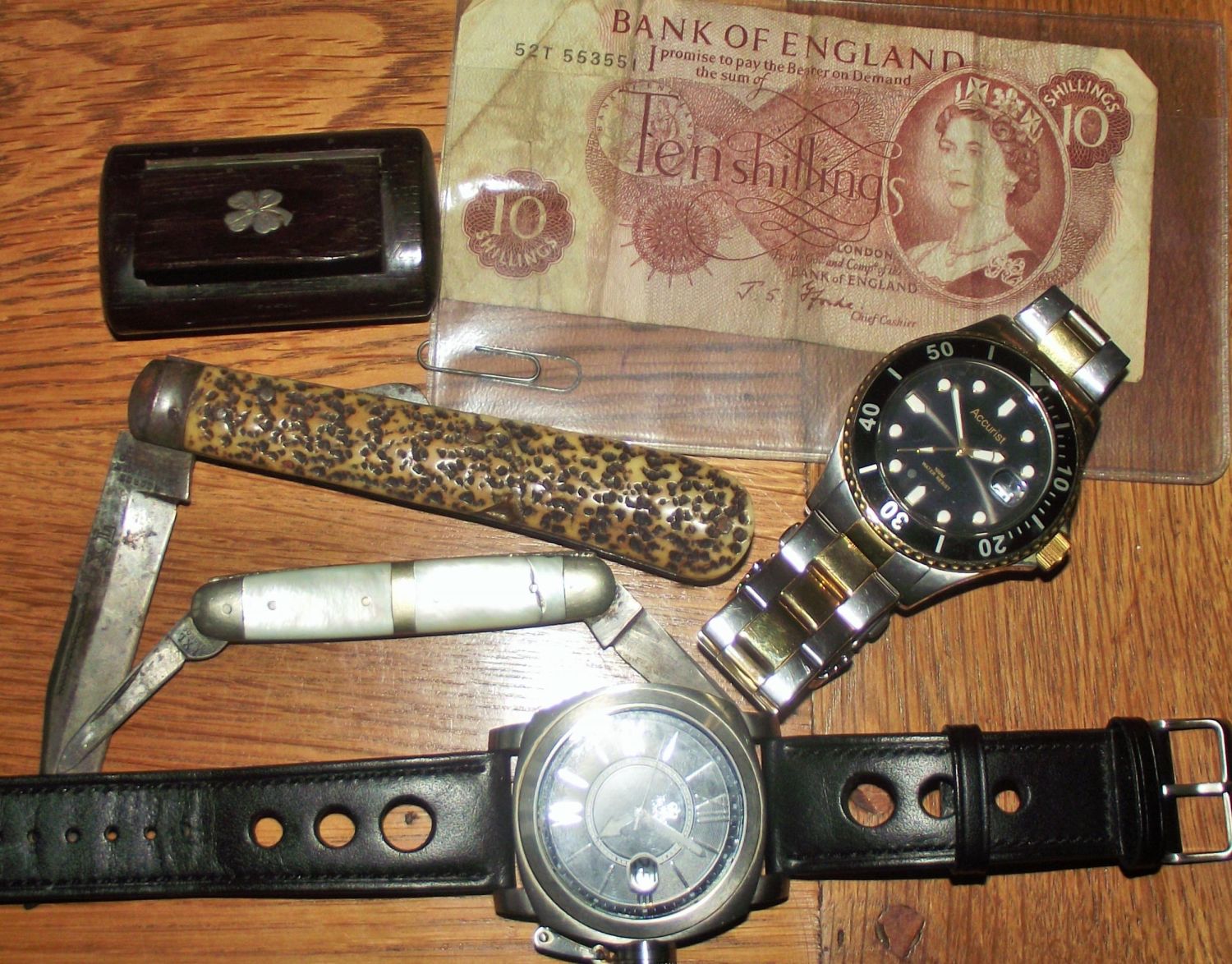 Mixed lot Inc. Antique wooden snuff box with inlaid flower head motif + unusual Royal London divers watch with screw over lock to winder + stainless steel Accurist gents watch ( both not seen working) + 2 old penknives ( some damage to handles ) + old bank of England 10 shilling note,