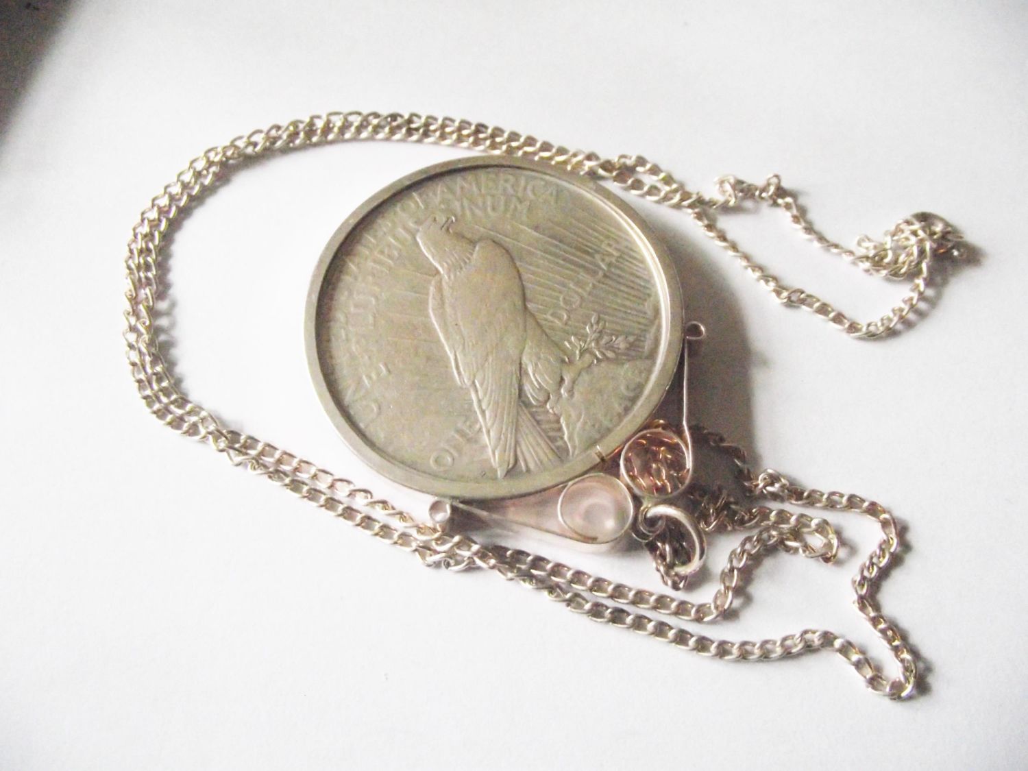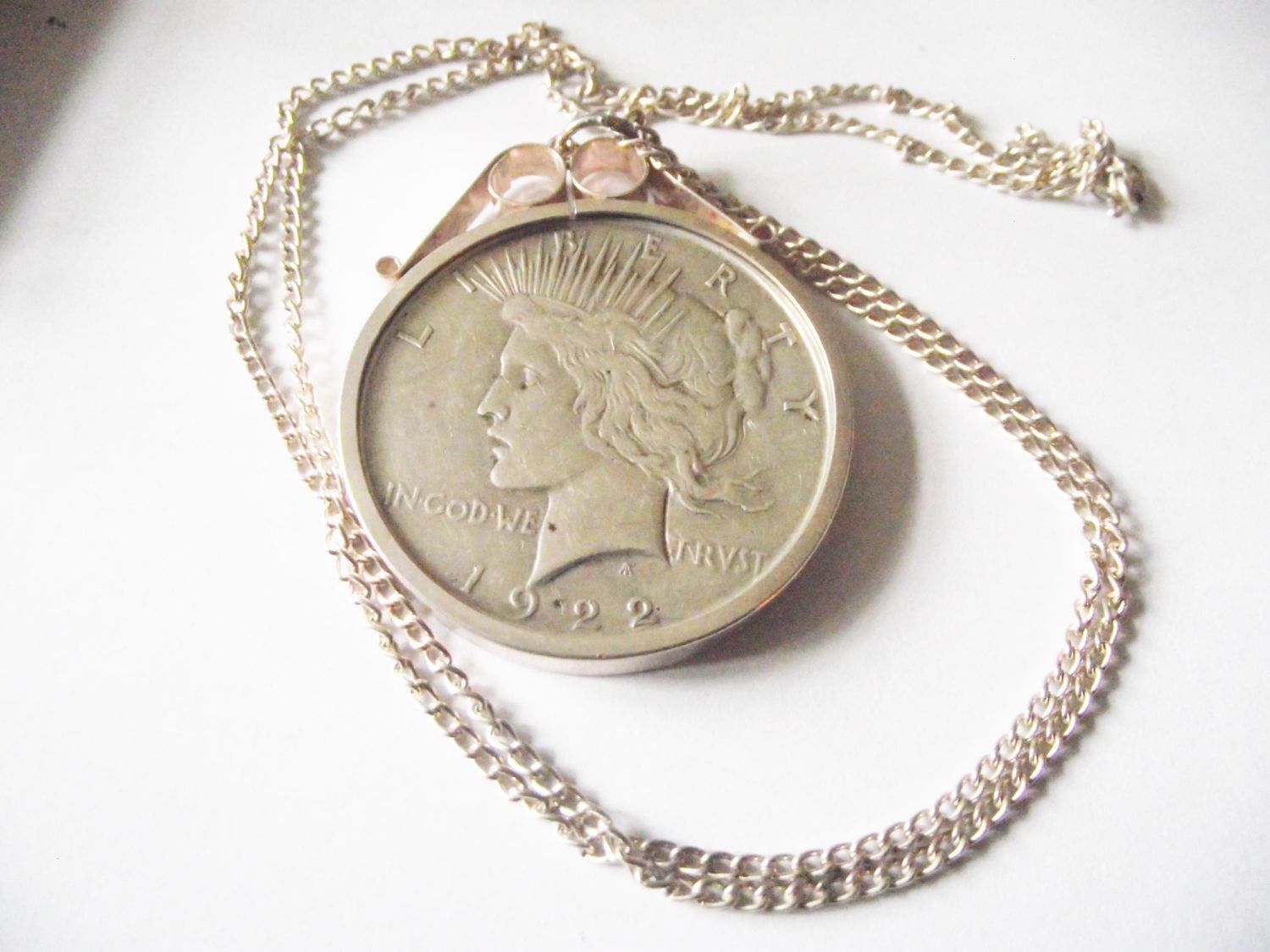 1922 silver dollar coin encased in white metal mount on white metal chain.