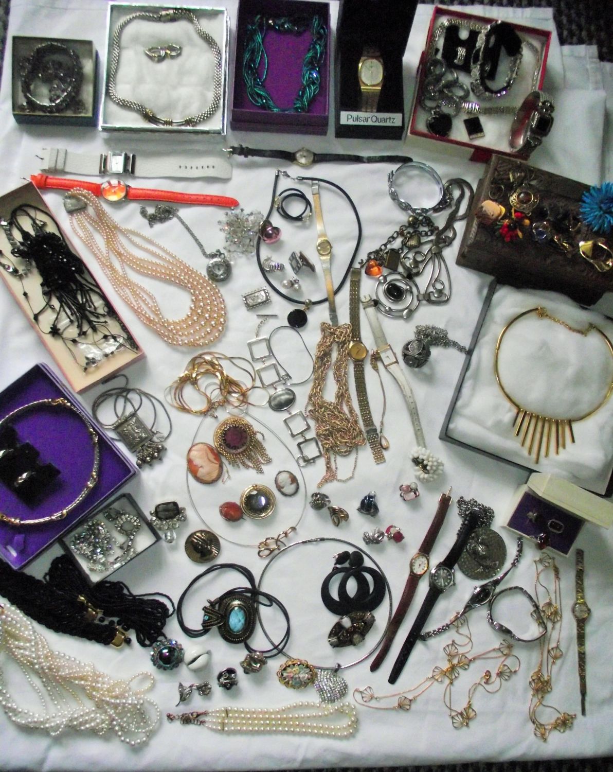 Good selection of pearls, necklaces, bracelets , dress watches ,paired earrings + wooden carved jewellery box with secret lock etc
