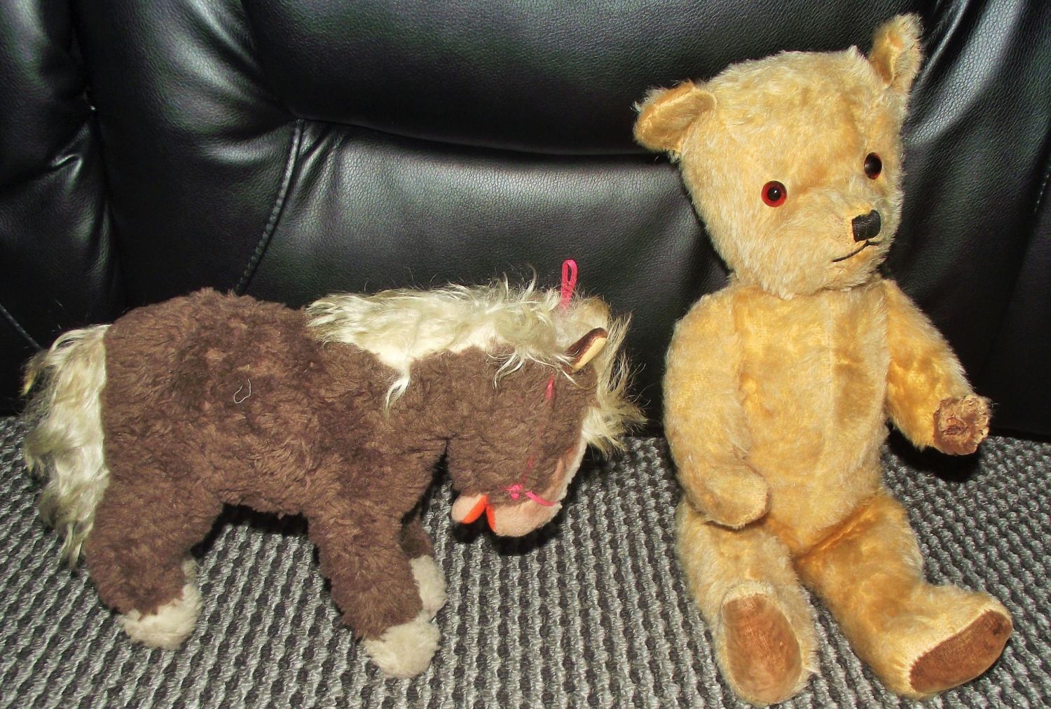 Steiff plush hair pony Steiff button in ear orange mouth dark brown coat with white socks white mane brown & black eyes 12×7 approx. + nice early (possibly Chiltern) well-worn jointed teddy bear 17 approx. with stitched nose & mouth velvet paws fully jointed with growler brown& black eyes some damage to paw , losses of fur and some re stitching
