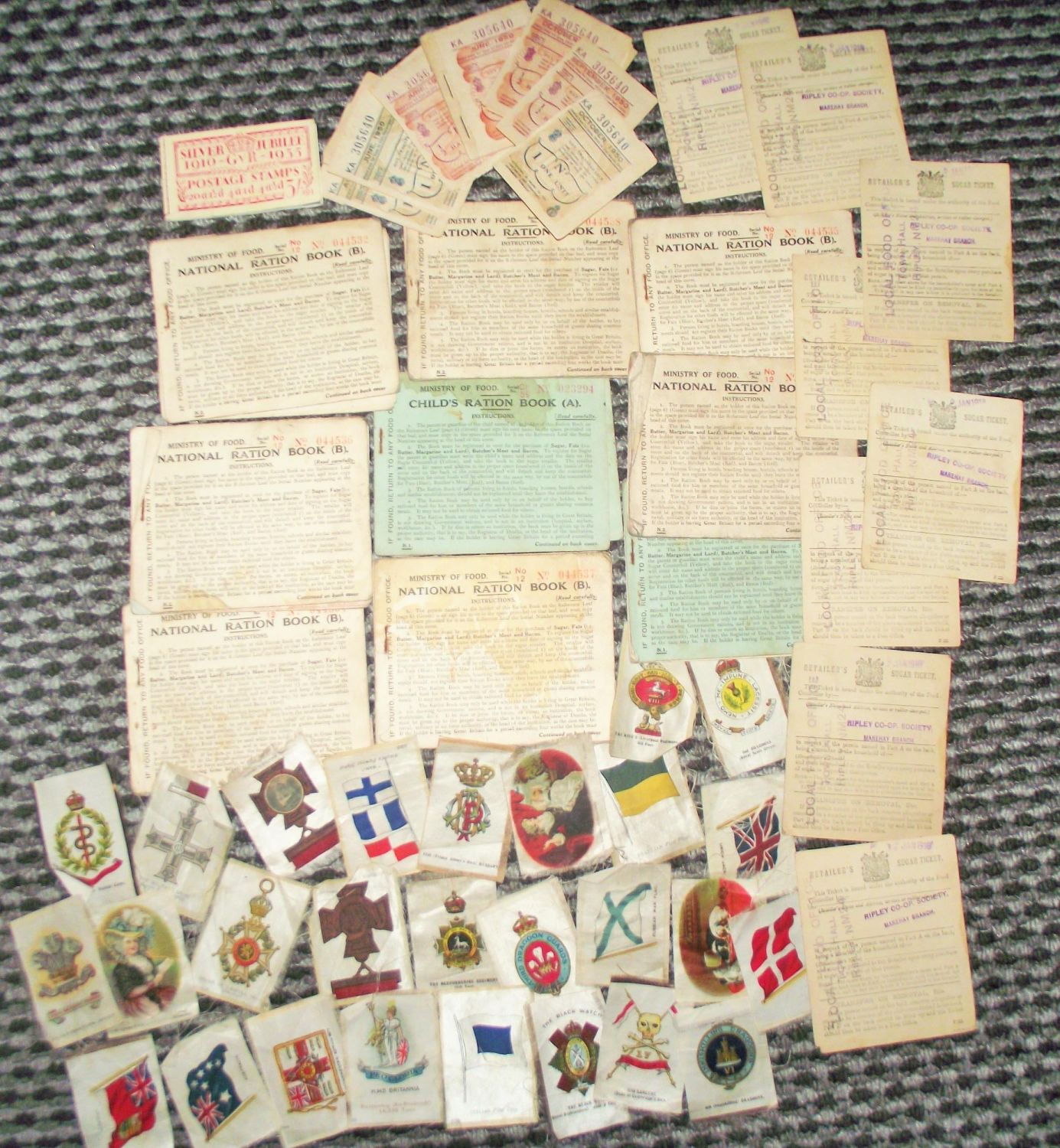 7x 1918 used ration books + 3 childs ration books + 8x 1918 sugar tickets + silver jubilee 1910 /35 postage stamp book 6 of 8 stamps remaining + 16 loose & 1 unused book of 13 1950 one 7 half fuel cards + 27 silks
